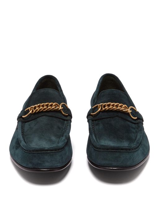 Ces mocassins Solway signés Burberry se composent de daim vert forêt et adoptent une chaîne à maillons dorée sur l'empeigne qui rappelle les modèles d'archives des années 60 à 70. De confection italienne, ils dessinent une silhouette en amande classique reposant sur un petit talon rainuré. Une doublure et une semelle intérieure en cuir noir lisse étayent l'ensemble. La paire est conforme à la pointure indiquée. Coloris : vert