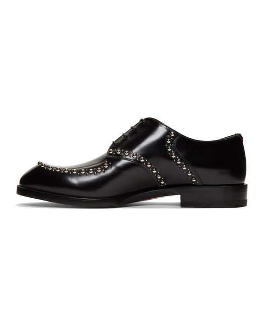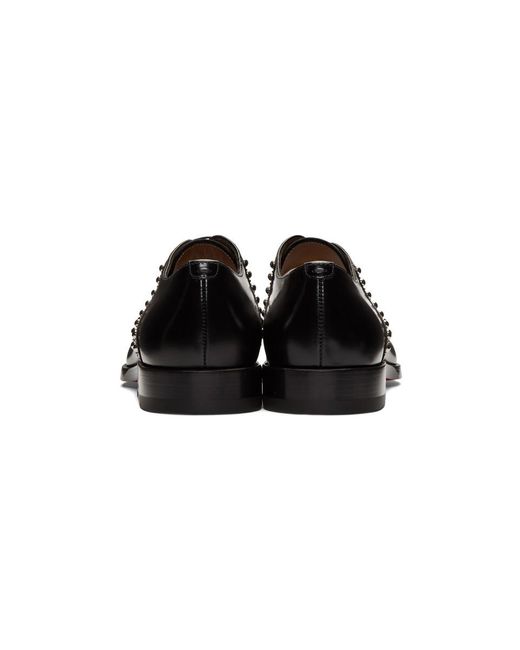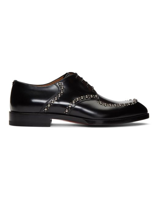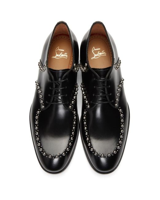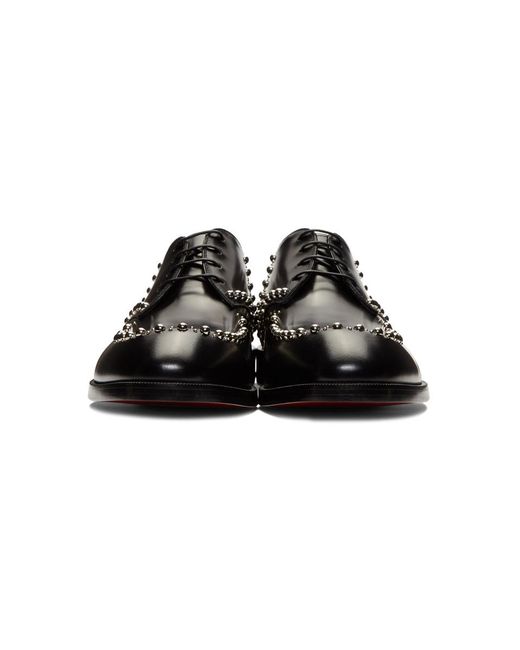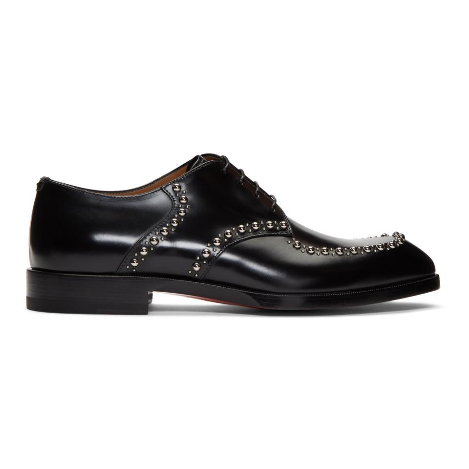 Derbys en cuir de veau poli noirs. Clous decoratifs sur lensemble. Bout en amande. Lacage ton sur ton. Empiecement en caoutchouc moule par injection au talon etage en cuir. Semelle en cuir rouge emblematique. Ferrures argentees. Couleur du fournisseur: Black. Coloris : noir