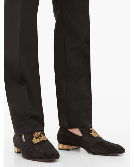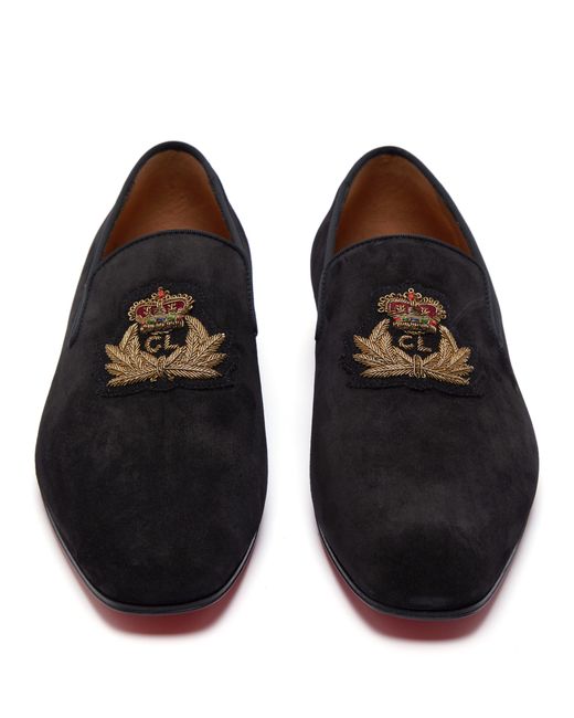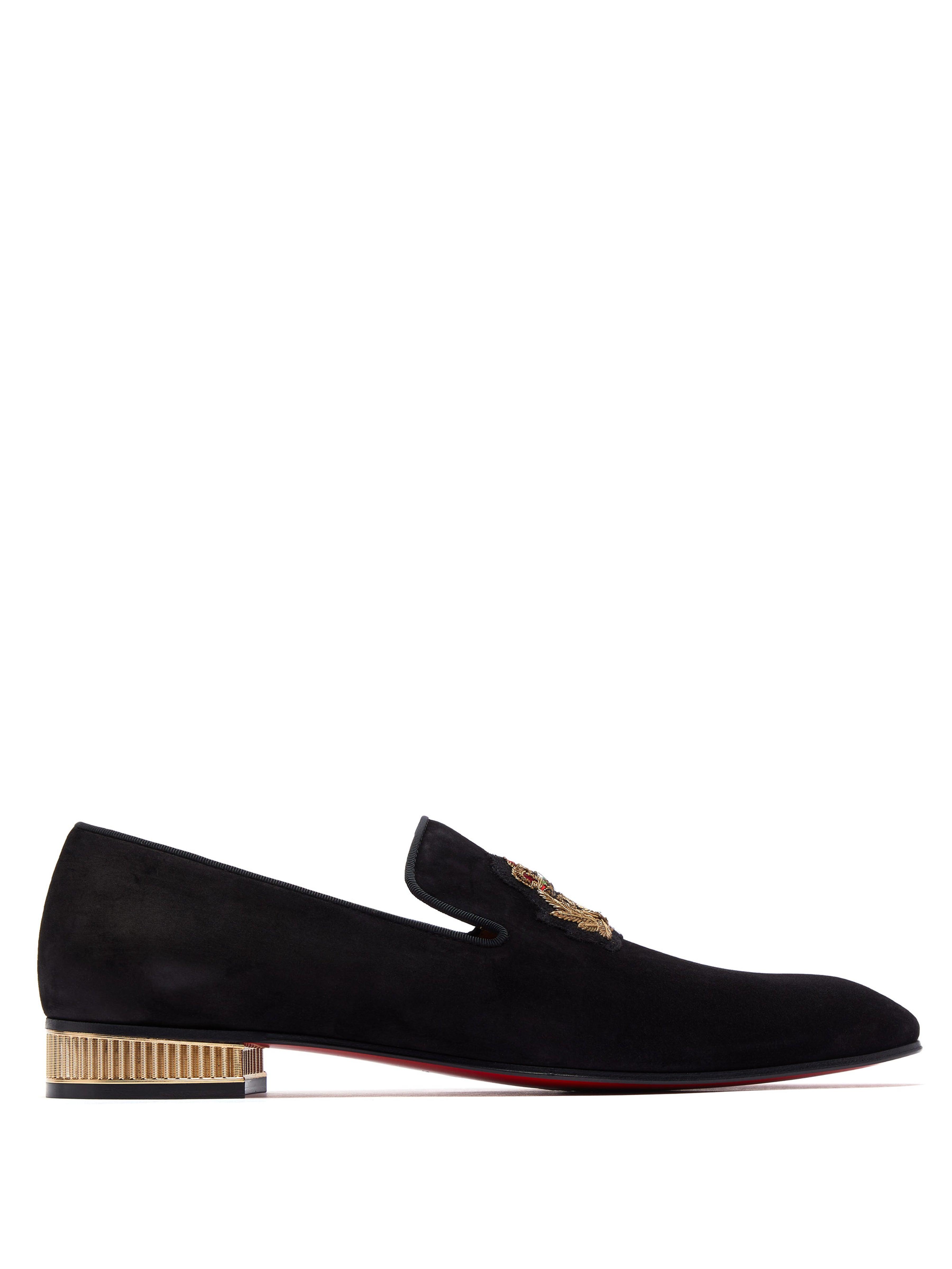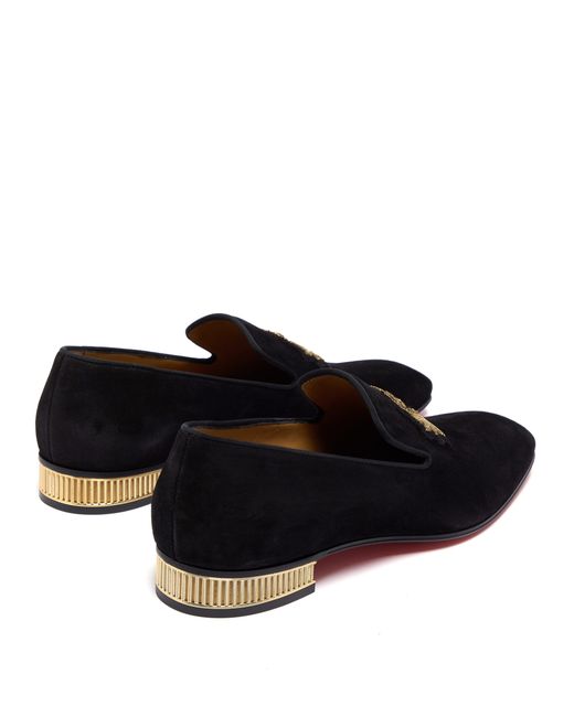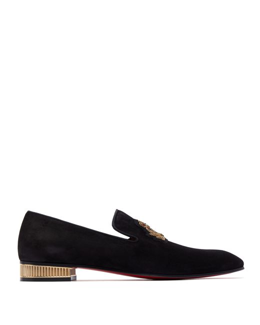 Cette élégante paire de mocassins noire Captain Colonnaki signée Christian Louboutin présente un talon doré inspiré du tube de mascara Les Yeux Noirs de la maison. Confectionnées en Italie en daim somptueux avec un bord en gros-grain, ils présentent l'écusson de la marque ornant le bout et le dessus de la chaussure dans des nuances métallisées intenses. Ils sont conformes à la pointure indiquée. Coloris : noir