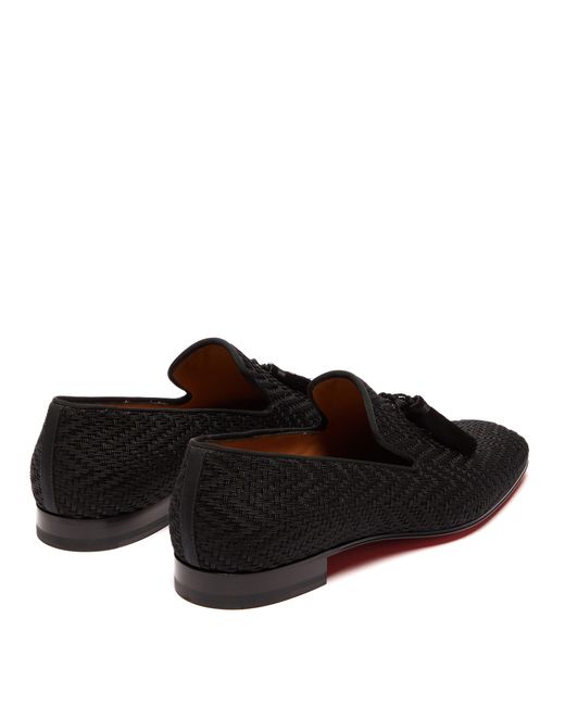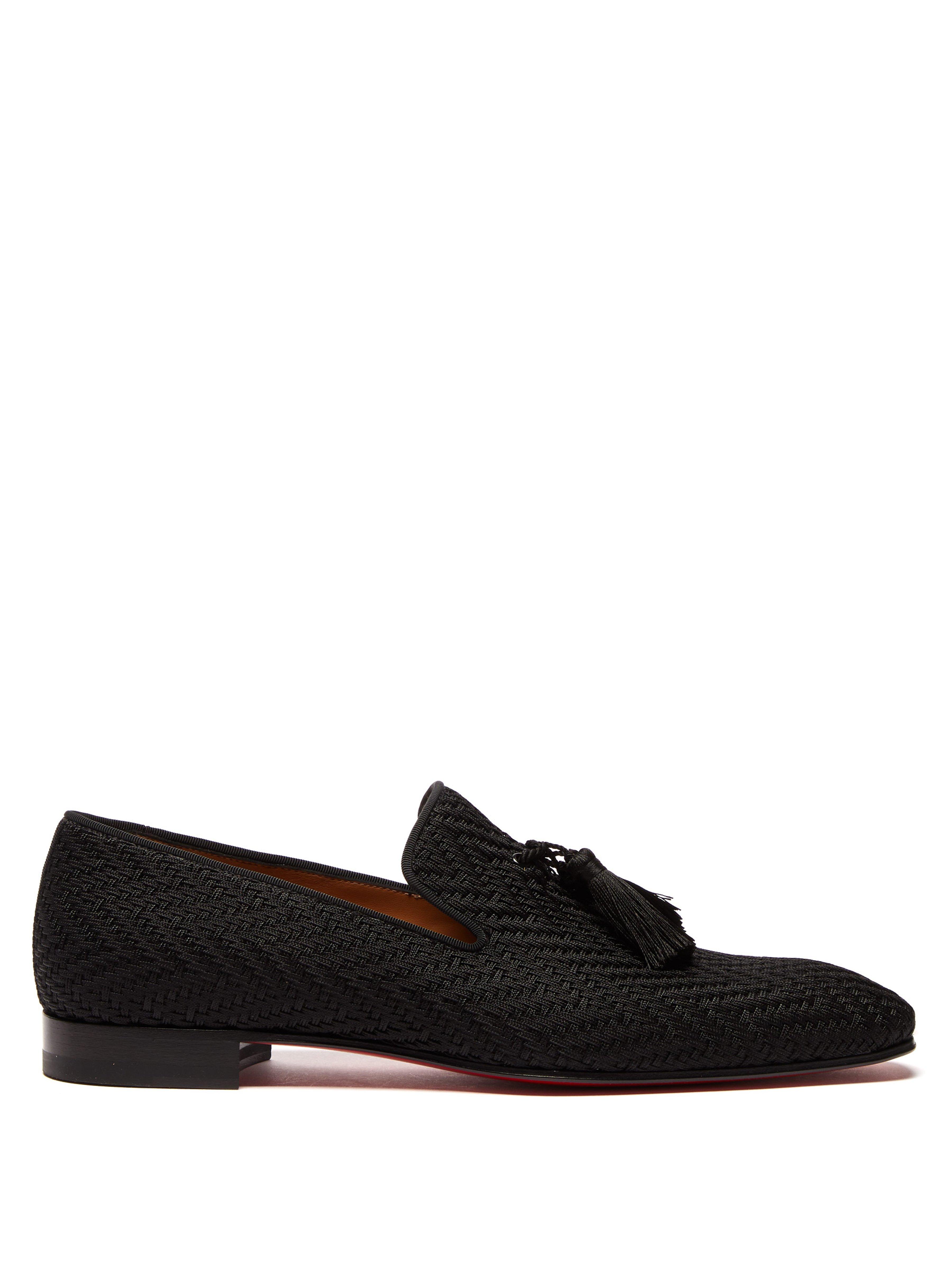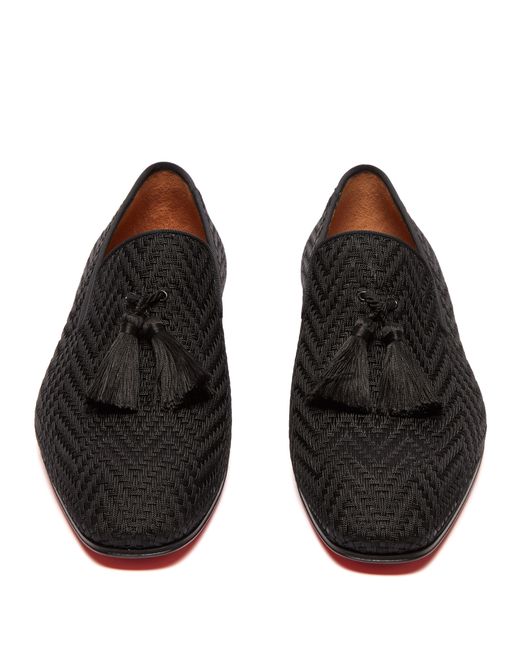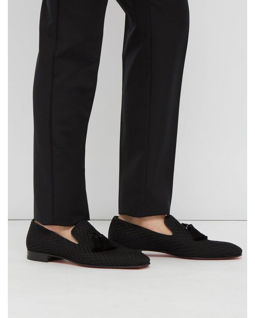Ces mocassins Officialito signés Christian Louboutin affichent une allure intemporelle déclinée en noir cette saison. Leur construction en sergé légèrement brillant arbore un motif à chevrons tissé et dessine une silhouette classique soulignée par une empeigne surélevée, ornée de deux houppes. Conformes à la pointure indiquée. Coloris : noir