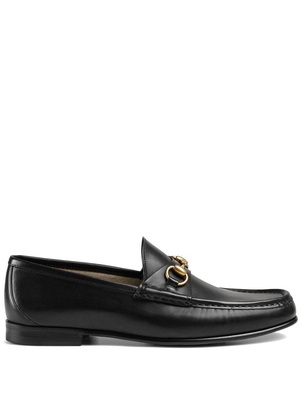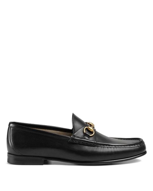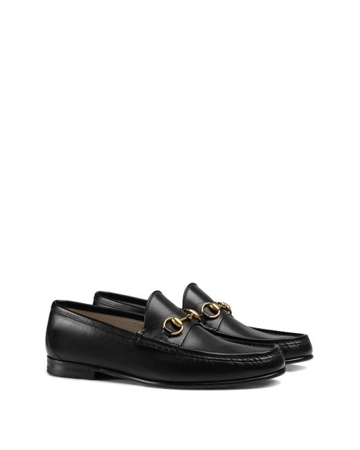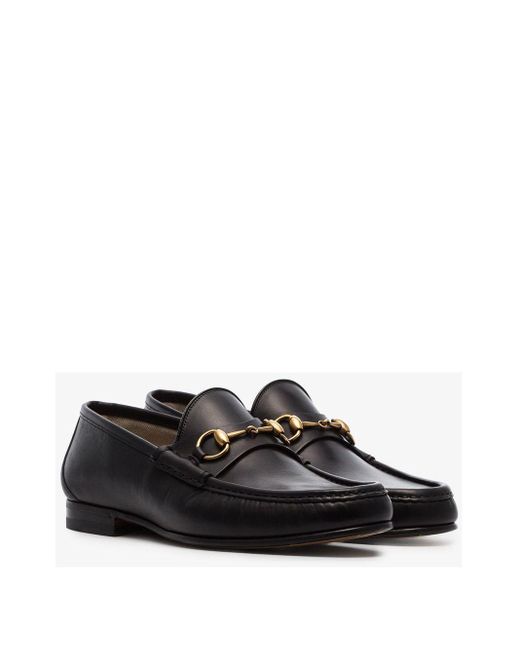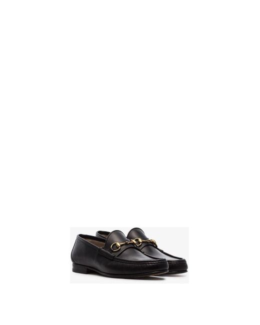 Mocassins à mors 1953 en cuir noir Gucci. Les mocassins à mors emblématiques Gucci issus de la Collection 1953 : étiquette 60ème anniversaire. Modèle en cuir noir pour homme à détail de mors en métal doré, semelle en cuir de 15 mm de hauteur. Fabriqués en Italie. Coloris : noir