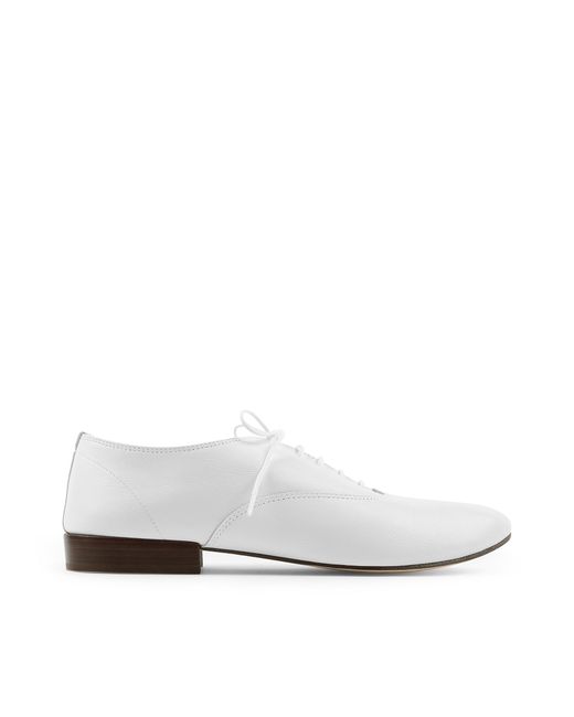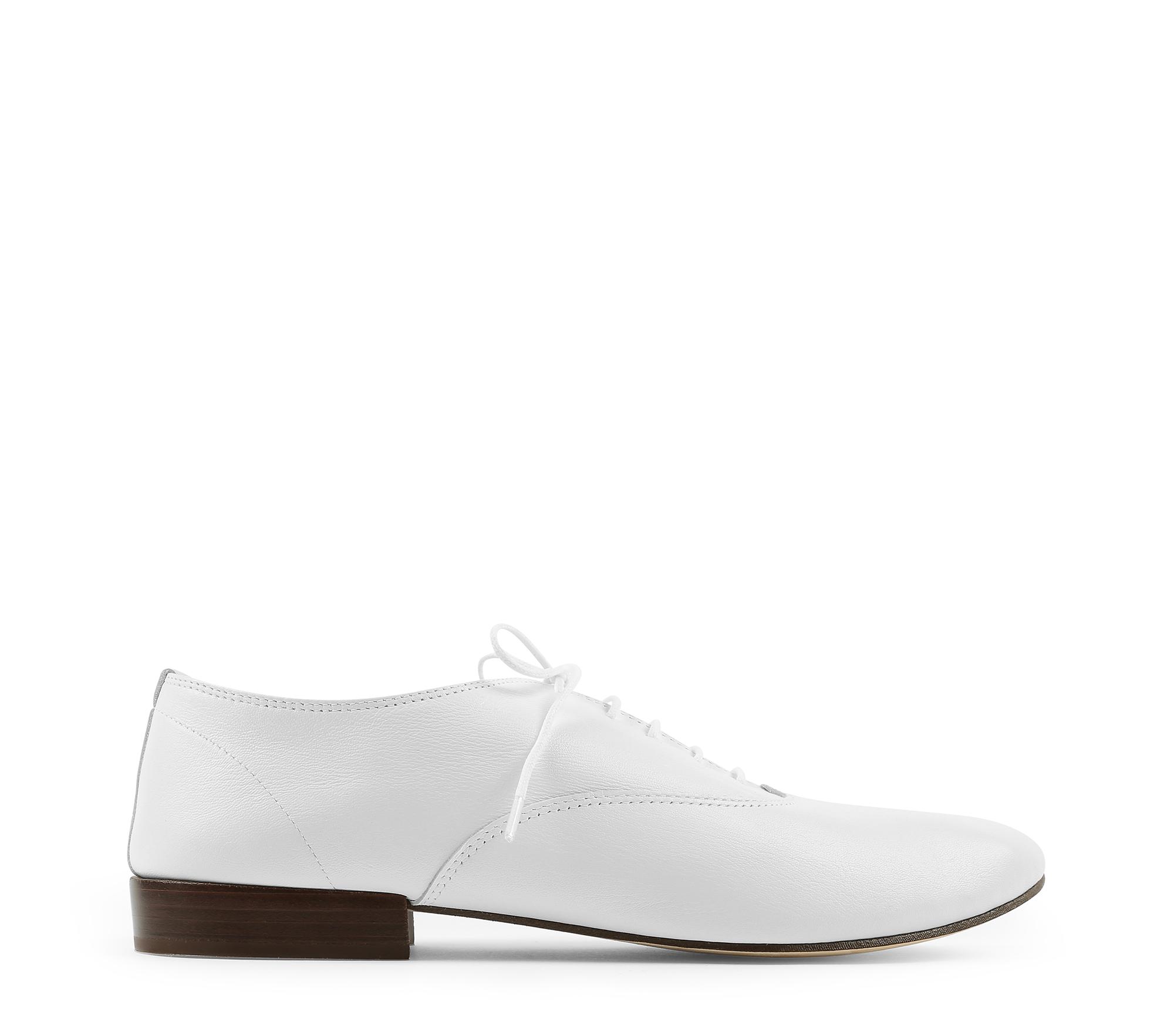 Richelieu original. Chaussure à lacets inspirée du chausson de jazz. Le modèle Zizi est un classique de la collection homme. Talon cuir 20 mm. Première de propreté en mouton blanc. Non doublé. Semelle extérieure croupon. Fabriqué en France. Issu de notre savoir-faire 'danse', le cousu retourné » est un procédé unique de fabrication mis au point par Madame Rose Repetto. Elle créait en 1947 ses premiers chaussons de danse selon cette technique, méthode aujourd'hui utilisée pour la confection de nos chaussures. La semelle est cousue à l'envers avant d'être retournée. Coloris : blanc