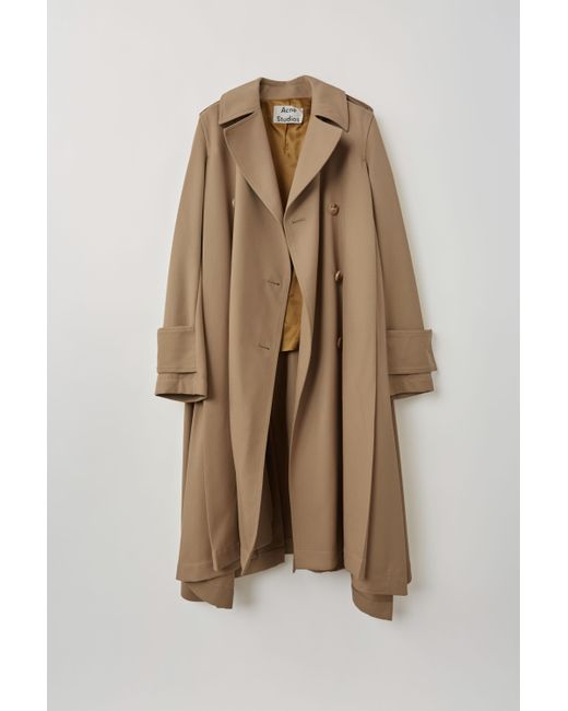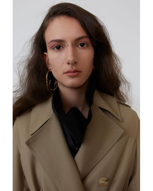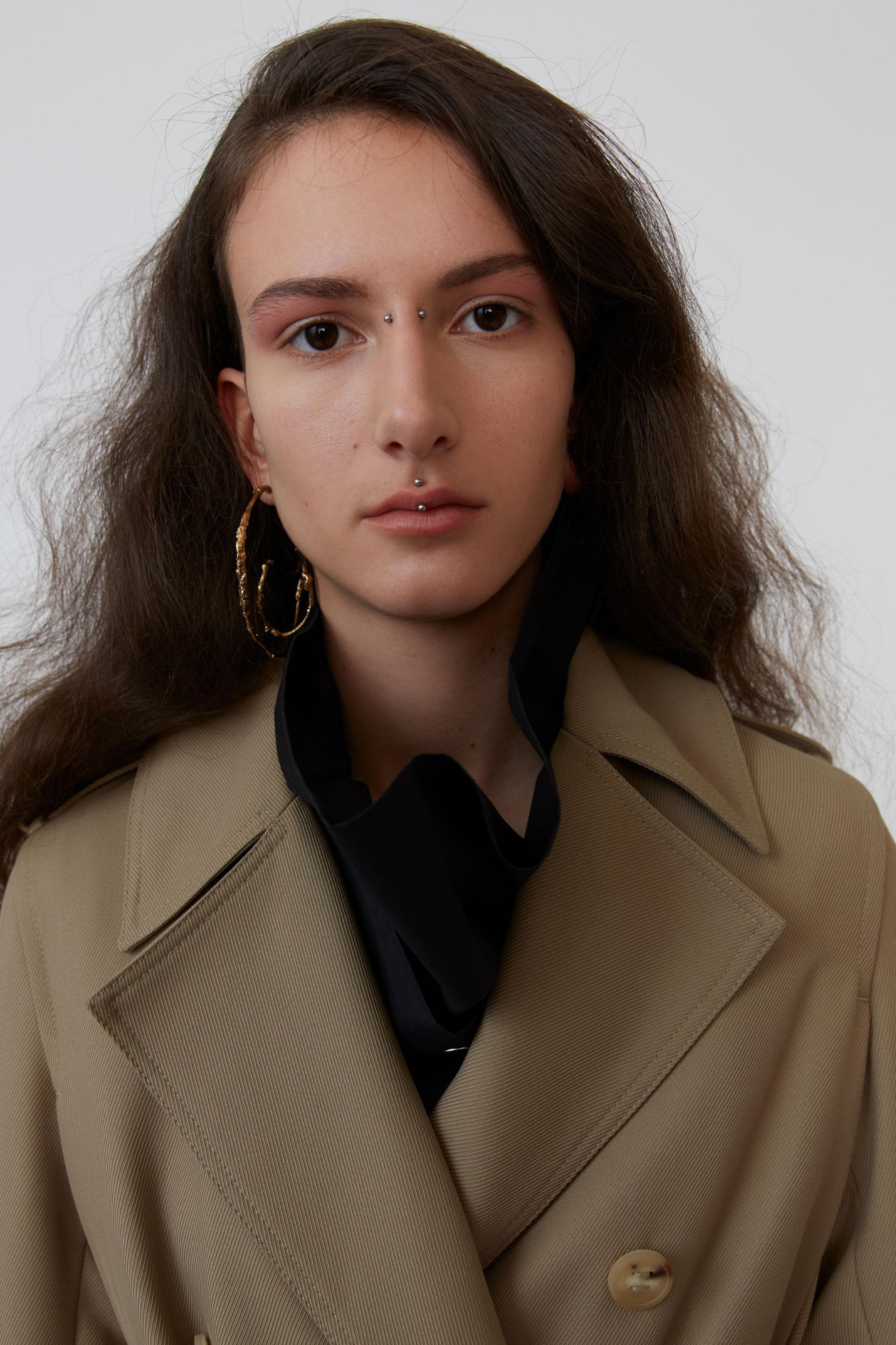 Trench croisé Acne Studios beige sable à coupe ample avec une ceinture amovible. Finitions avec des poches passepoilées inclinées et des épaulettes. Poches passepoilées inclinées. Grand pli sur la poitrine. Motif de côtes parallèles en diagonale. Paulettes classiques. Fermeture par bouton. Référence du modèle : FN-WN-OUTW000162. Extérieur : 55 % polyester, 45 % laine ; Doublure : 100 % viscose. Coloris : neutre