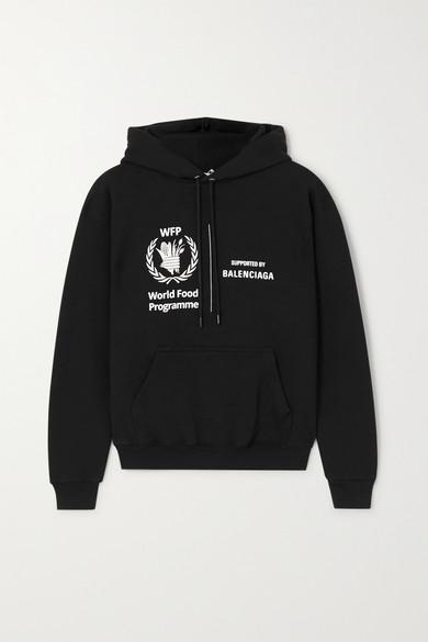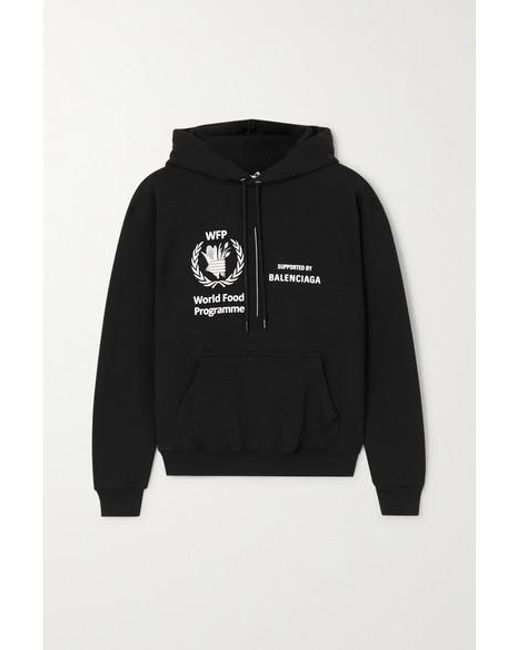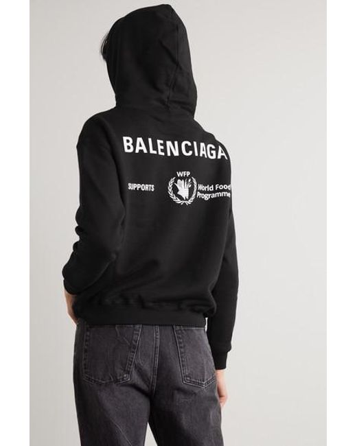 Balenciaga s'est encore une fois associé au Programme Alimentaire Mondial pour sa collection Croisière 2020, faisant ainsi connaître le désir de l'organisation d'éliminer la famine d'ici 2030. Ce sweat à capuche en jersey de coton est doublé de molleton pour une incroyable sensation de douceur sur la peau et imprimé des deux logos. Associez-le à un jean ou à un legging. Jersey de coton noir et blanc. S'enfile simplement. 100 % coton. Nettoyage à sec. Coloris : noir