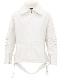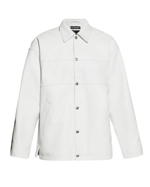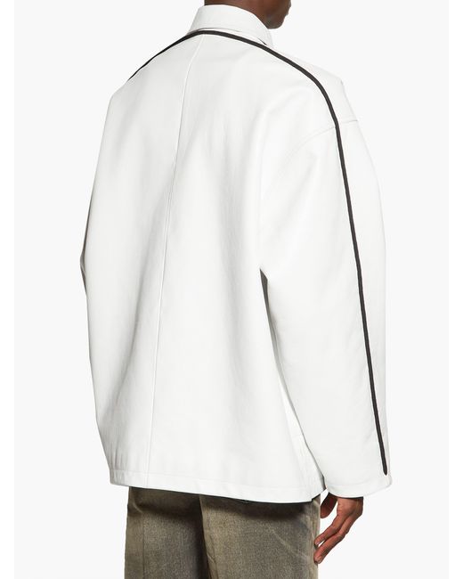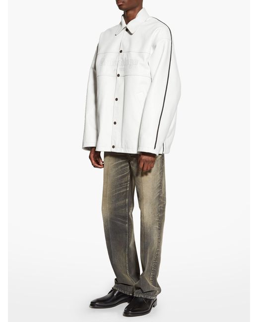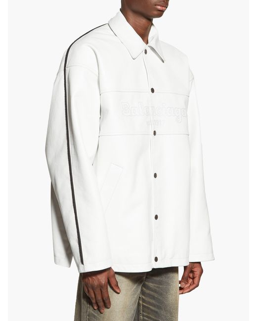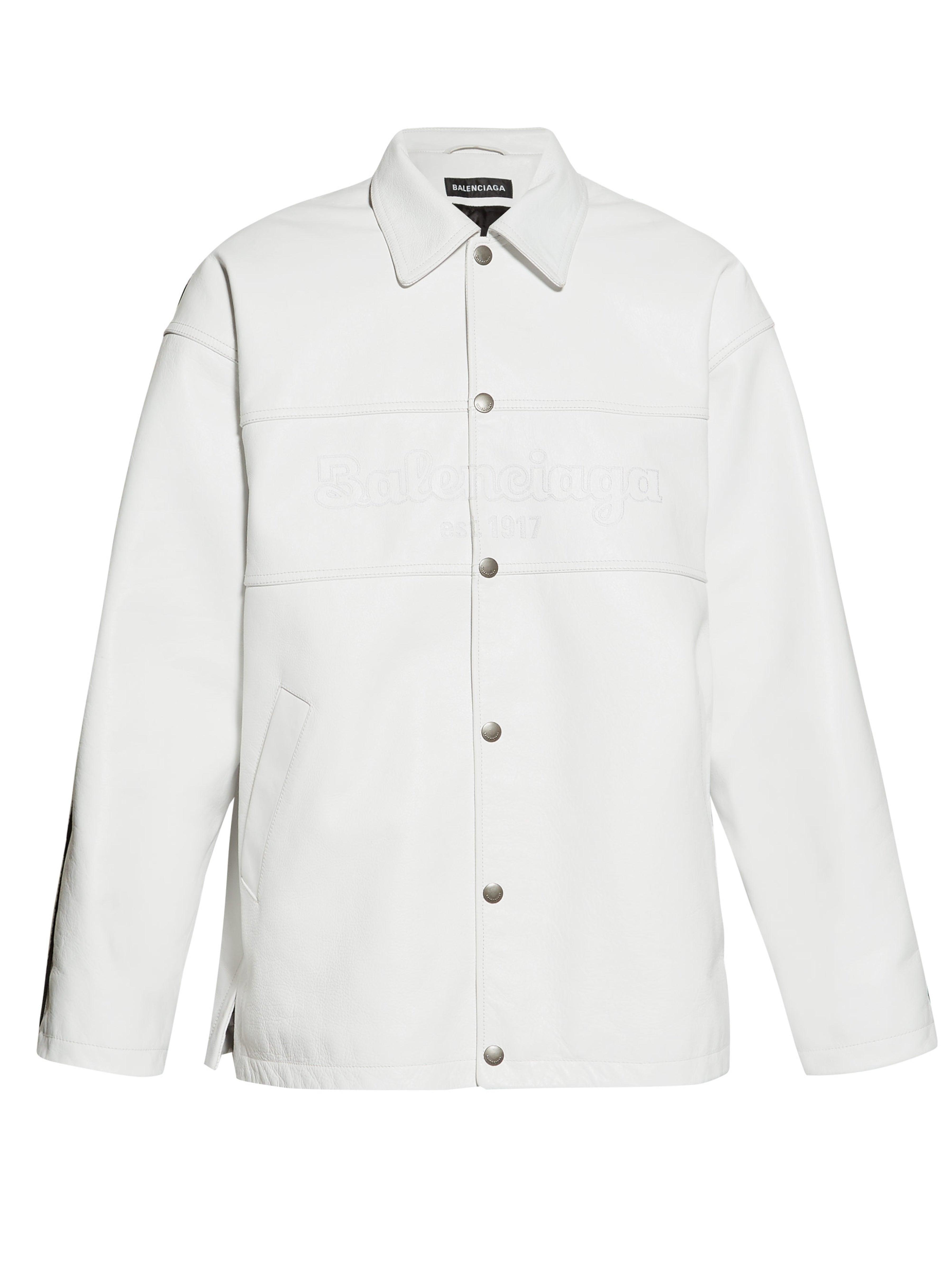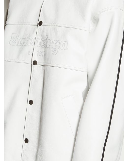 Cette veste en cuir blanc signée Balenciaga présente des épaules oversize dans la lignée des silhouettes exagérées du défilé de la collection automne-hiver 2019. De confection italienne, elle présente une broderie logo discrète sur le devant et des bords à liseré en toile noire. Sa coupe carrée est soulignée par un col en pointe minimaliste. Une doublure matelassée en satin noir sublime ce modèle luxueux. Elle est conforme à la taille indiquée. Coloris : blanc
