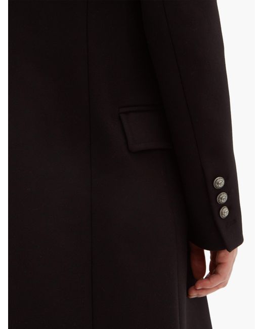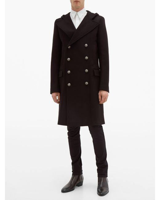 Accentuée par le style raffiné du directeur artistique Olivier Rousteing, l'esthétique militaire signature de Balmain se devine avec élégance de ce manteau noir à double boutonnage. Confectionné en laine mélangée à un soupçon de cachemire pour sa douceur, il arbore une capuche et des revers en pointe surplombant une sélection épurée de boutons gravés oversize. Il est conforme à la taille indiquée. Coloris : noir