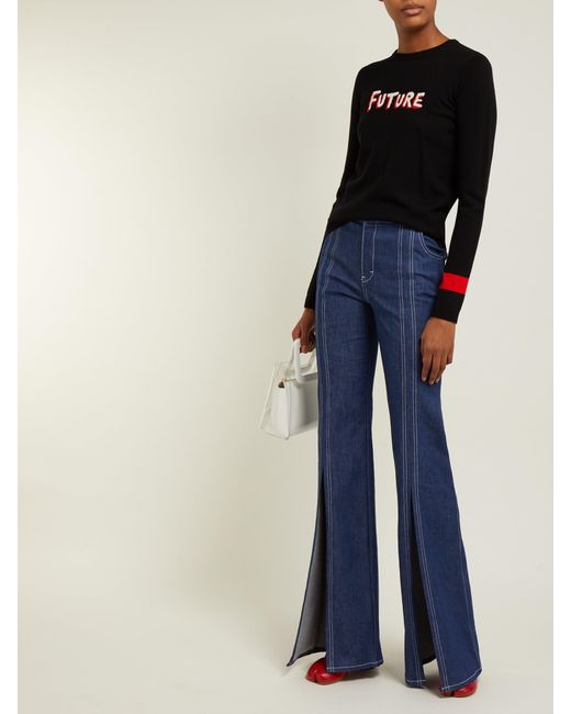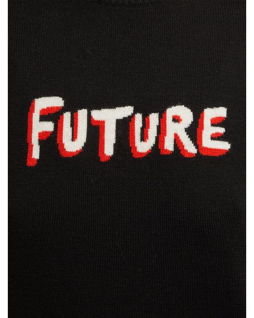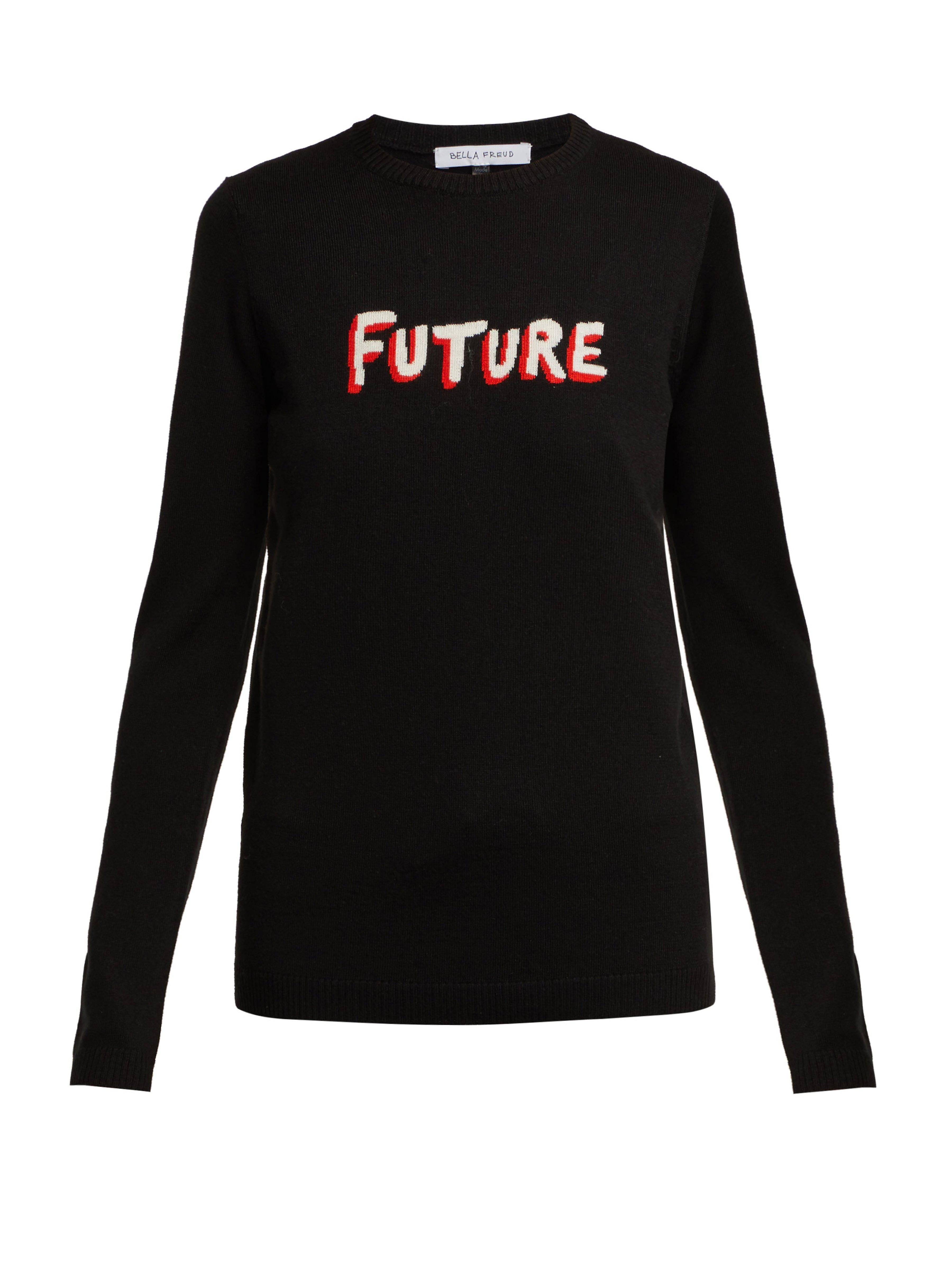 Les pièces en maille signature de Bella Freud sont agrémentées du nouveau slogan Future cette saison. Ce pull en laine noire esquisse une coupe décontractée avec un col ras du cou et des manches longues, dont l'une dévoile une bande rouge au-dessus du poignet. Il s'achève sur un ourlet en maille côtelée. Accompagnez-le d'un jean évasé pour un composer un ensemble confortable et sobre en accord avec le style du label. Coloris : noir