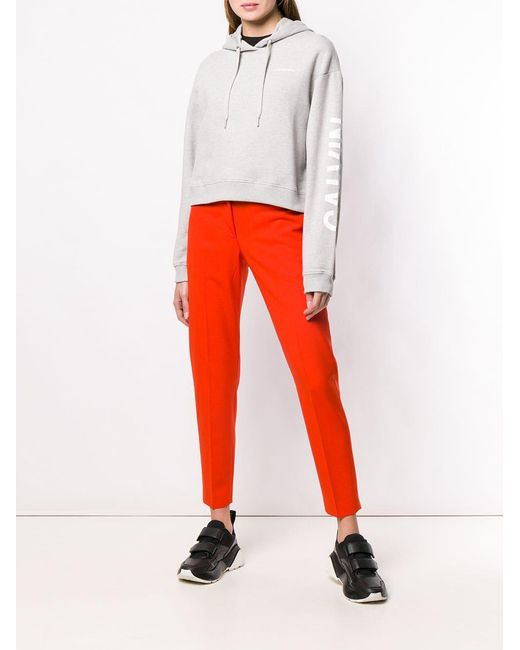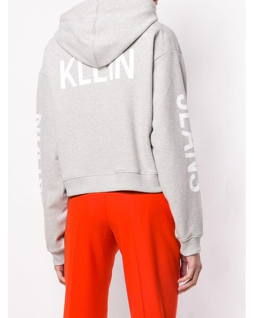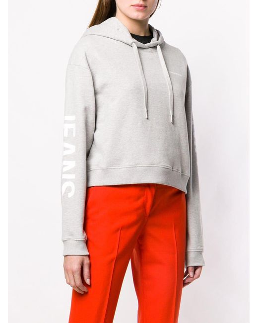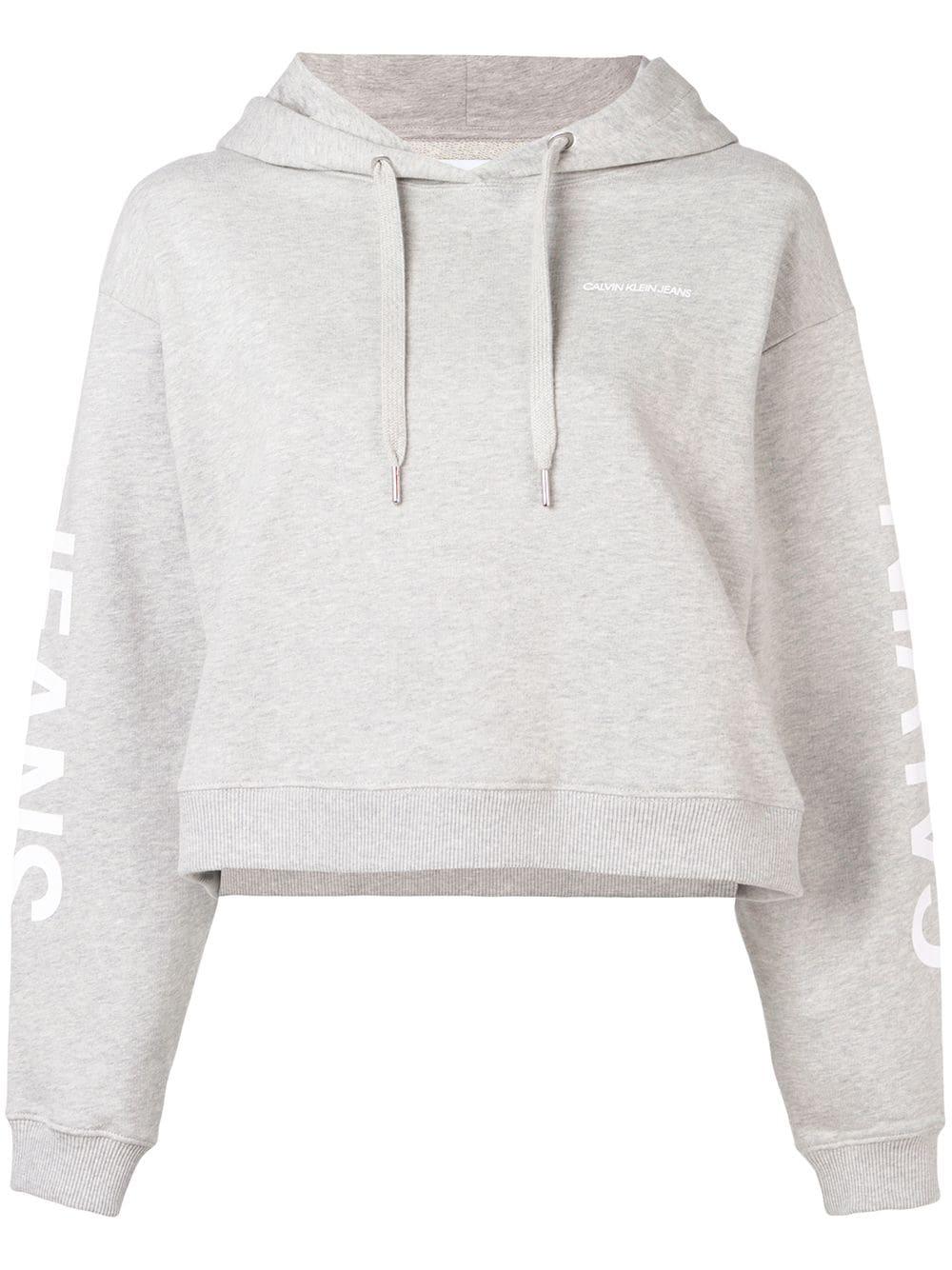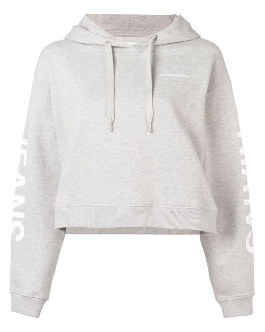 Sweat crop à capuche en coton Calvin Klein Jeans avec capuche à lien de resserrage, manches longues, ourlet et poignets nervurés et ourlet droit. Couleur : gris. Coloris : gris