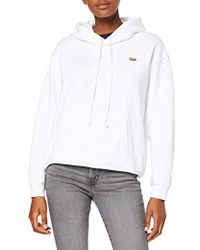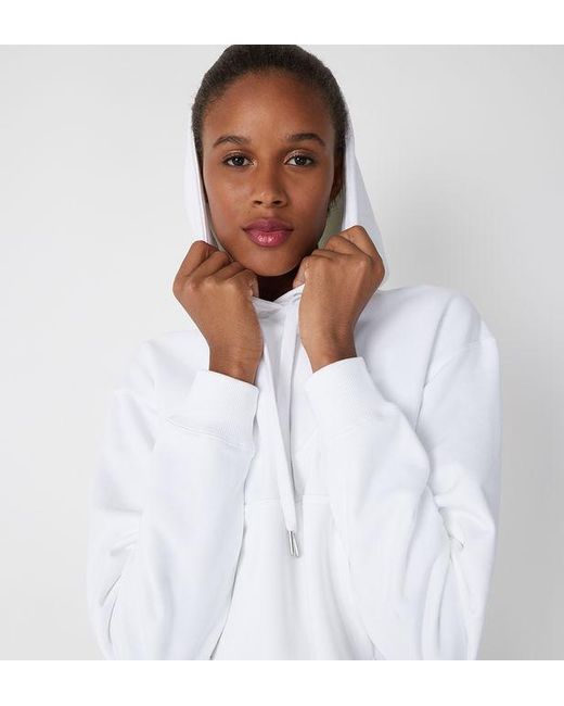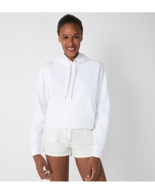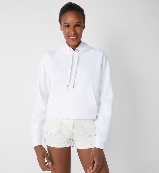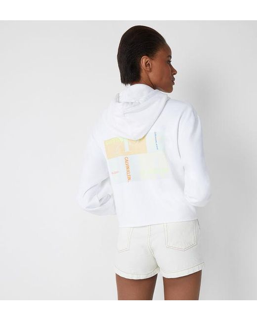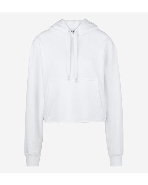 Ce sweat court ample Calvin Klein composé de coton blanc est muni d'une capuche agrémentée d'un lien de serrage sur col rond, de manches longues, d'une poche kangourou et d'une application contrastante au dos de rectangles siglés. Coloris : blanc