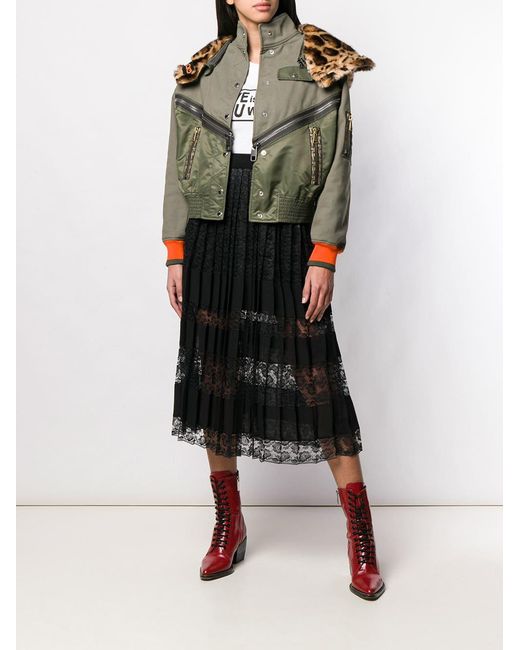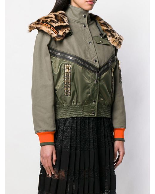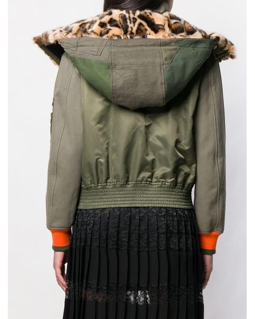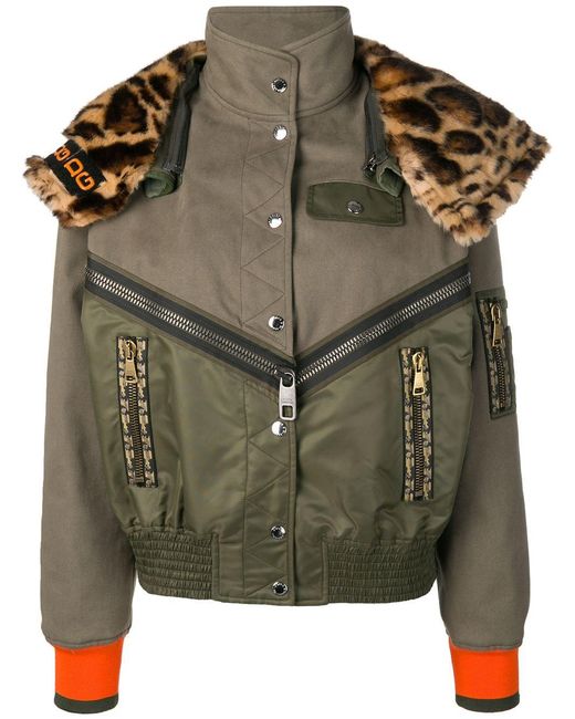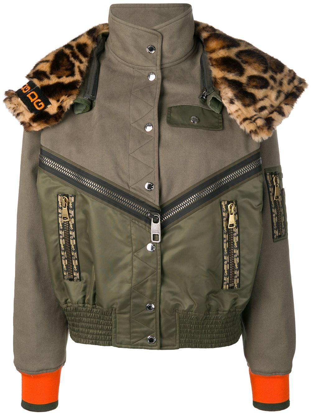 Veste bomber à col imprimé léopard en cotton blend Dolce & Gabbana avec boutons pression, poches latérales zippées, capuche détachable, col cheminée, empiècements contrastants, bordure en fourrure artificielle et poche poitrine. Coloris : vert