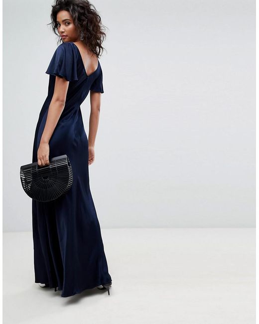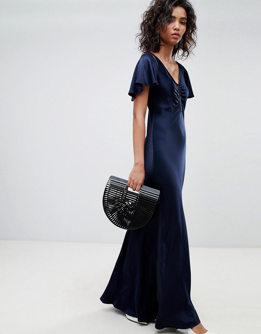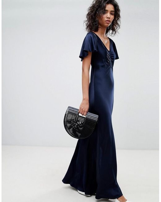 Robe longue en satin avec mancherons évasés et détail froncé femme de coloris bleu