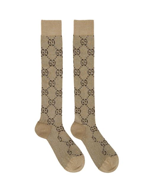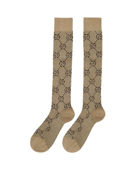 Chaussettes hauteur mollet en maille de coton melange beiges. Motif a logo GG brun et garniture en fil metallique dore sur lensemble. Revers en maille cotelee. Coutures ton sur ton. Coloris : neutre