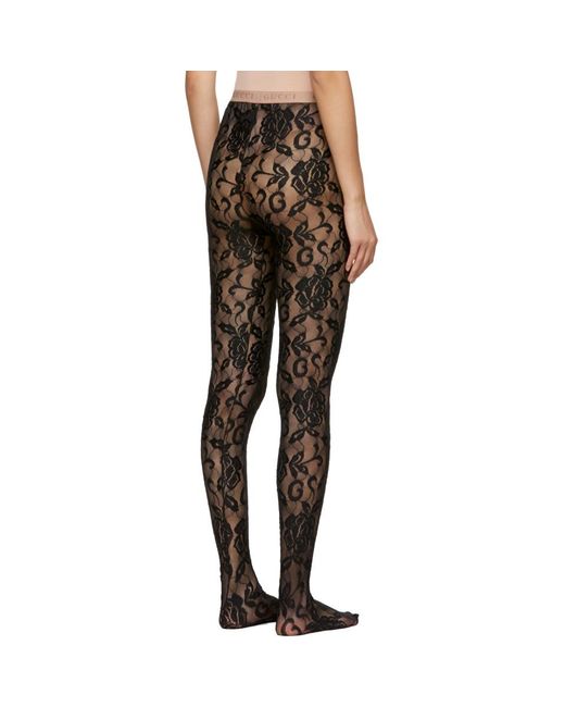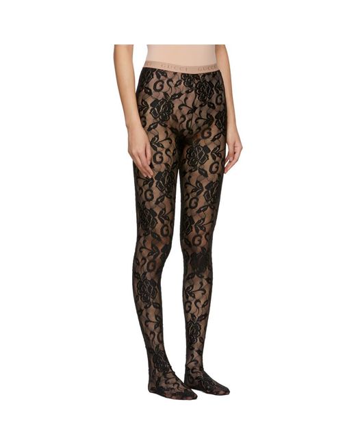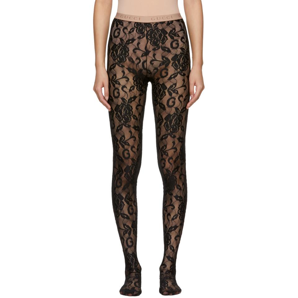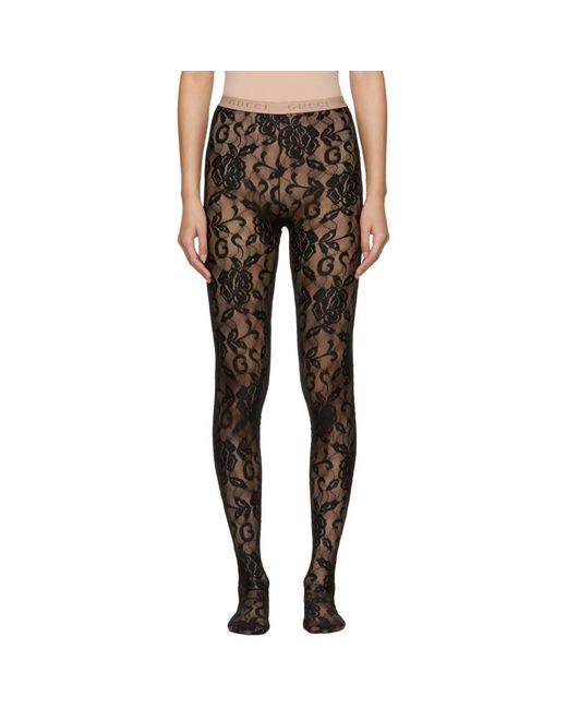 Collant en dentelle fleurie extensible noir. Taille elastique avec logo en maille beige. Coutures ton sur ton. Coloris : noir