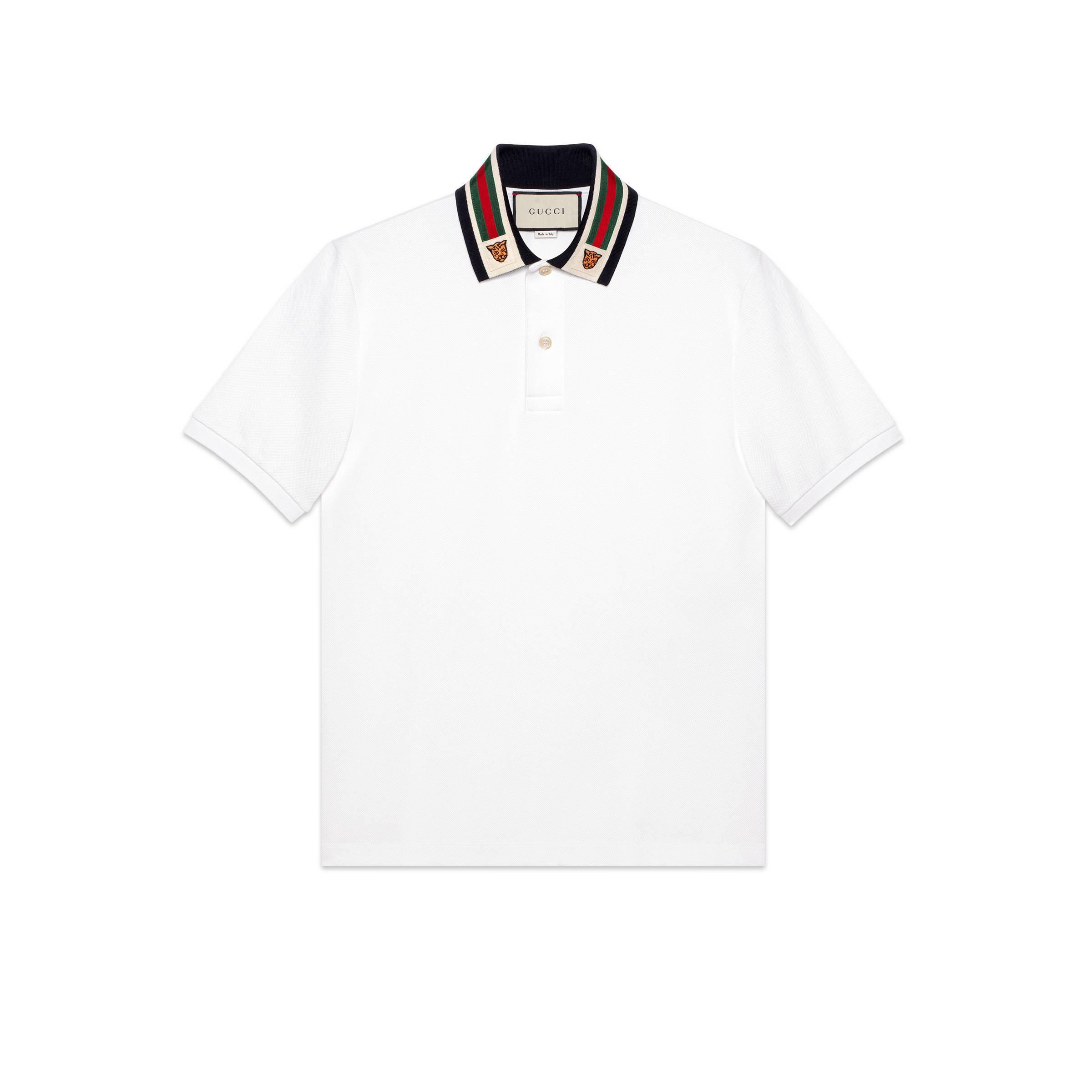 Parmi les animaux qui peuplent l'univers luxuriant de la maison, la tête de tigre est aujourd'hui revisitée dans un style ludique qui rappelle les illustrations des livres pour enfants. Les codes emblématiques de gucci se réinventent dans un style sport-chic. Ainsi, la tête de félin s'associe à la bande web vert et rouge classique pour orner les pointes de col de ce polo. Piqué de coton stretch blanc. Bande web rouge et vert avec broderies tête de félin appliquées sur le col. Patte de boutonnage avec boutons en nacre. 93 % coton et 7 % élasthanne. Fabriqué en italie. Notre mannequin mesure 188cm et porte la taille m. RTW.