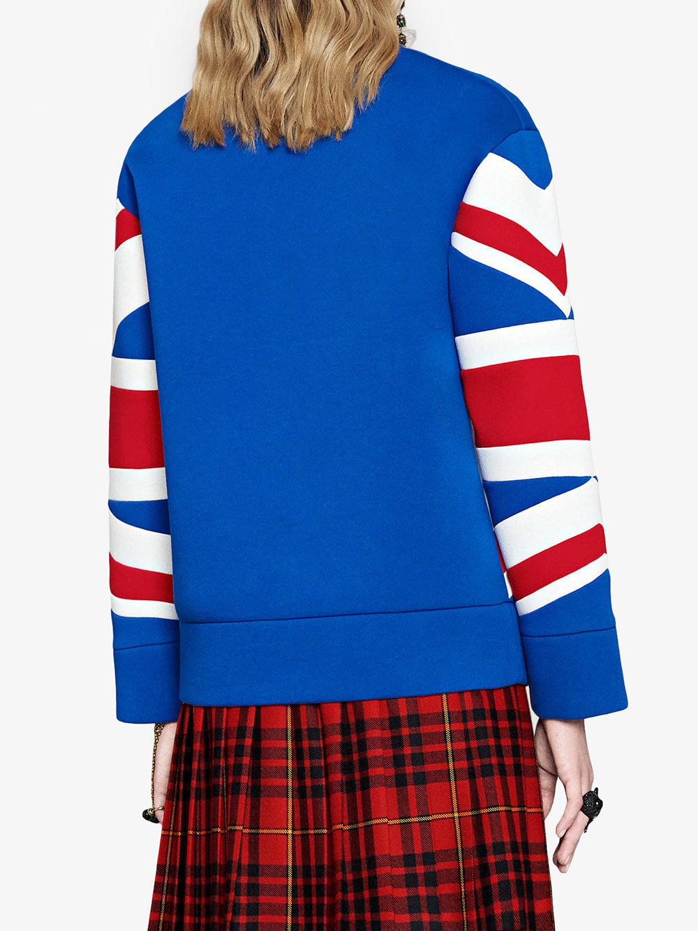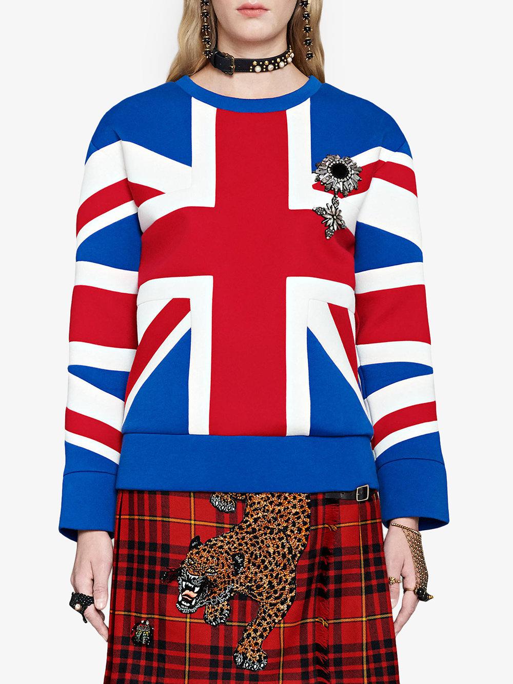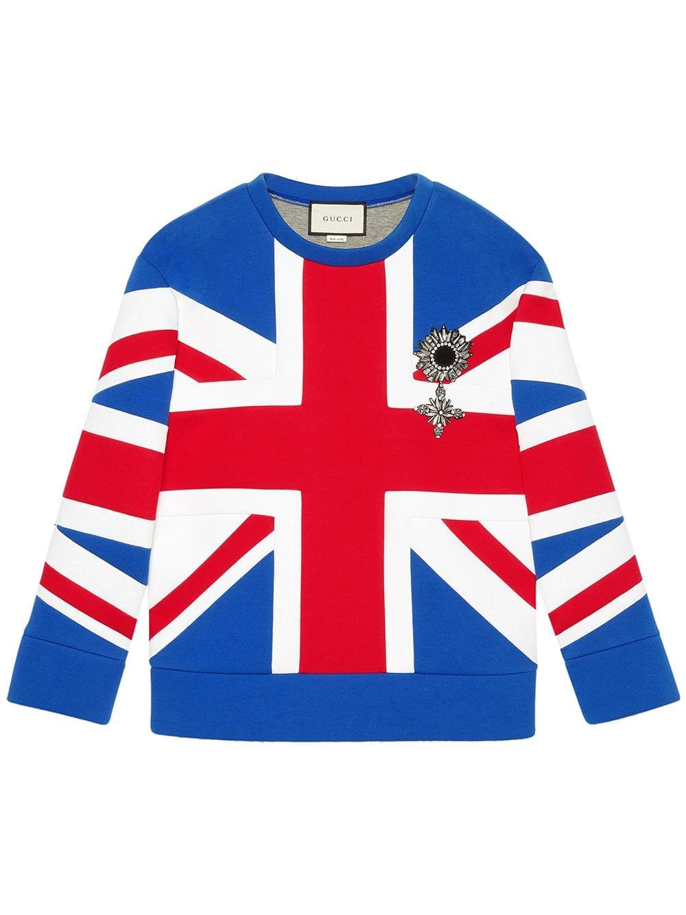 Sweat-shirt avec motif intarsia Union Jack Gucci. Influencé par le thème London Calling de notre collection Cruise, ce sweat-shirt associe le motif intarsia Union Jack à une cocarde appliquée avec cristaux. Paules arrondies. Manches trois-quarts. 100 % coton. Coloris : rouge