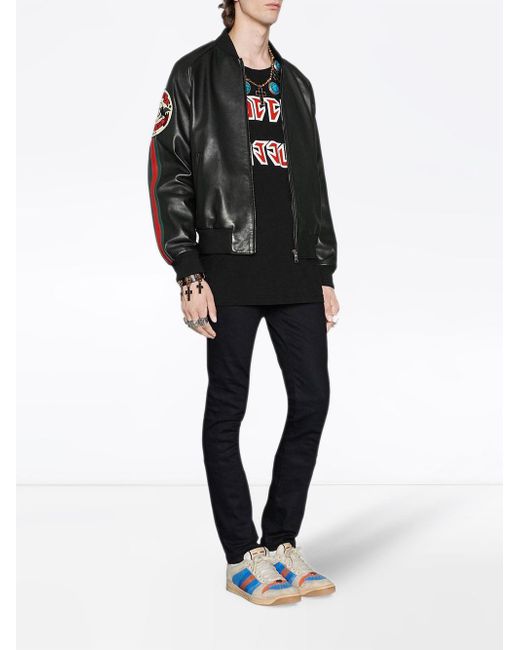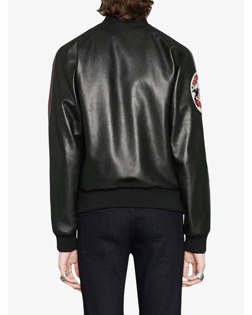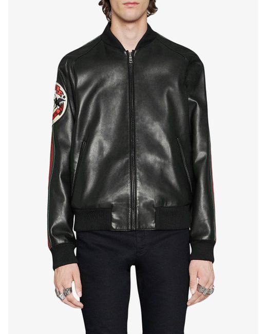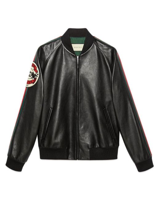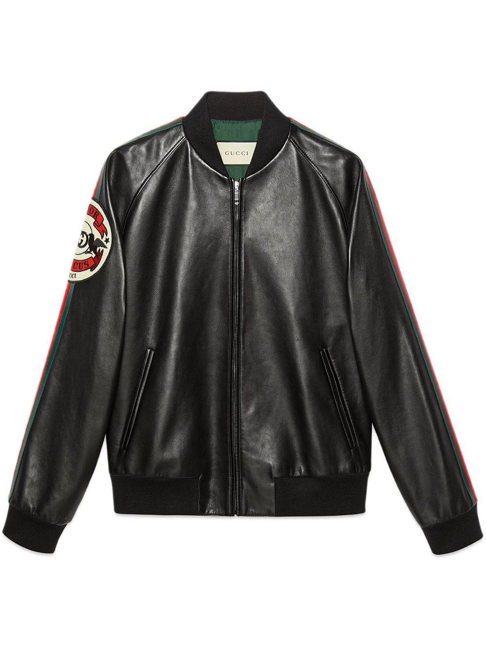 Veste bomber à appliqué en cuir Gucci avec détail Web vert et rouge. Couleur: noir. Coloris : noir