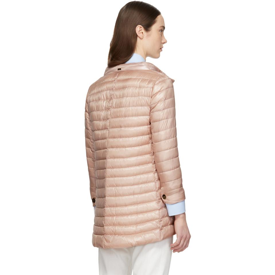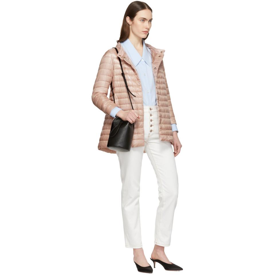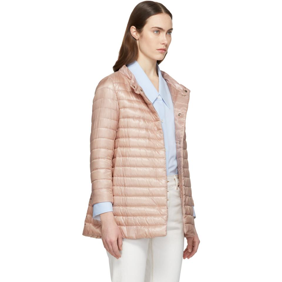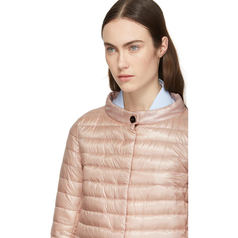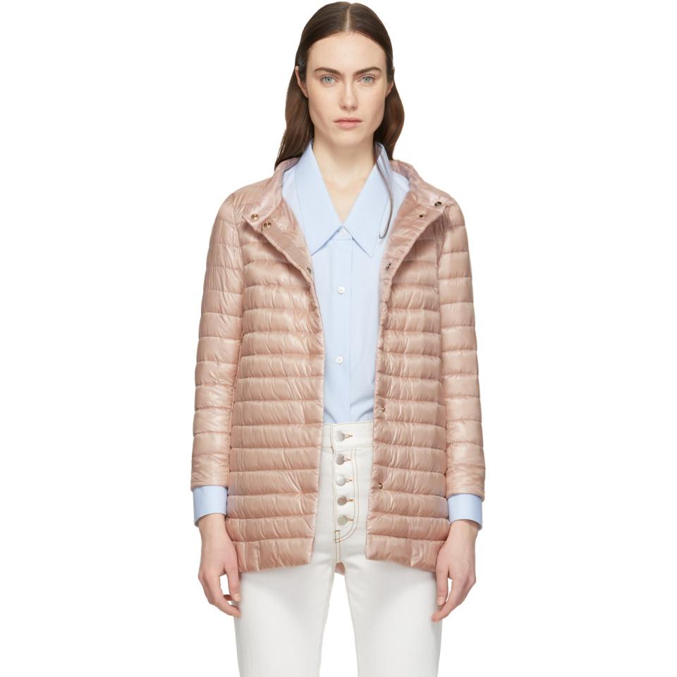 Consulter SSENSEBlouson a manches longues matelasse en duvet et satin de nylon rose blush. Col officier. Patte a boutons-pression dissimulee a lavant. Poches aux coutures a la taille. Poignets a boutons-pression. Ourlet allonge au dos. Ecusson a logo a linterieur. Entierement double. Ferrures dore pale a gravure du logo. Coutures ton sur ton. Rembourrage: 90% duvet doie, 10% plumes. Coloris : rose