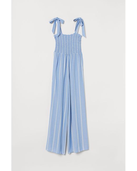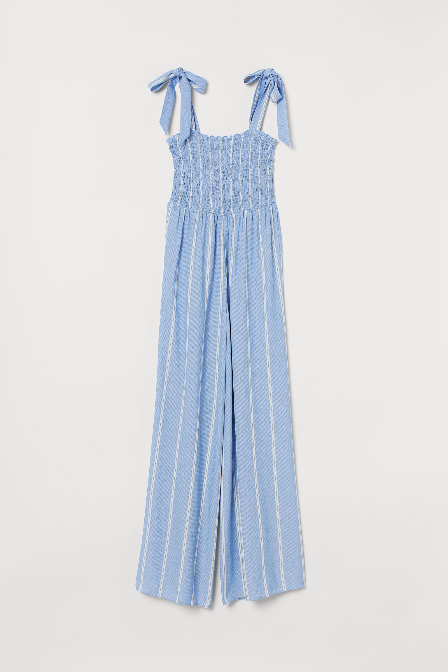 Combinaison en tissu de viscose froissé. Modèle avec corsage smocké et larges bretelles à nouer en haut. Taille haute et larges jambes droites. Non doublée. Coloris : bleu