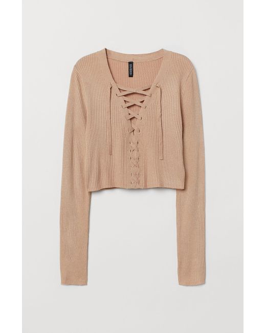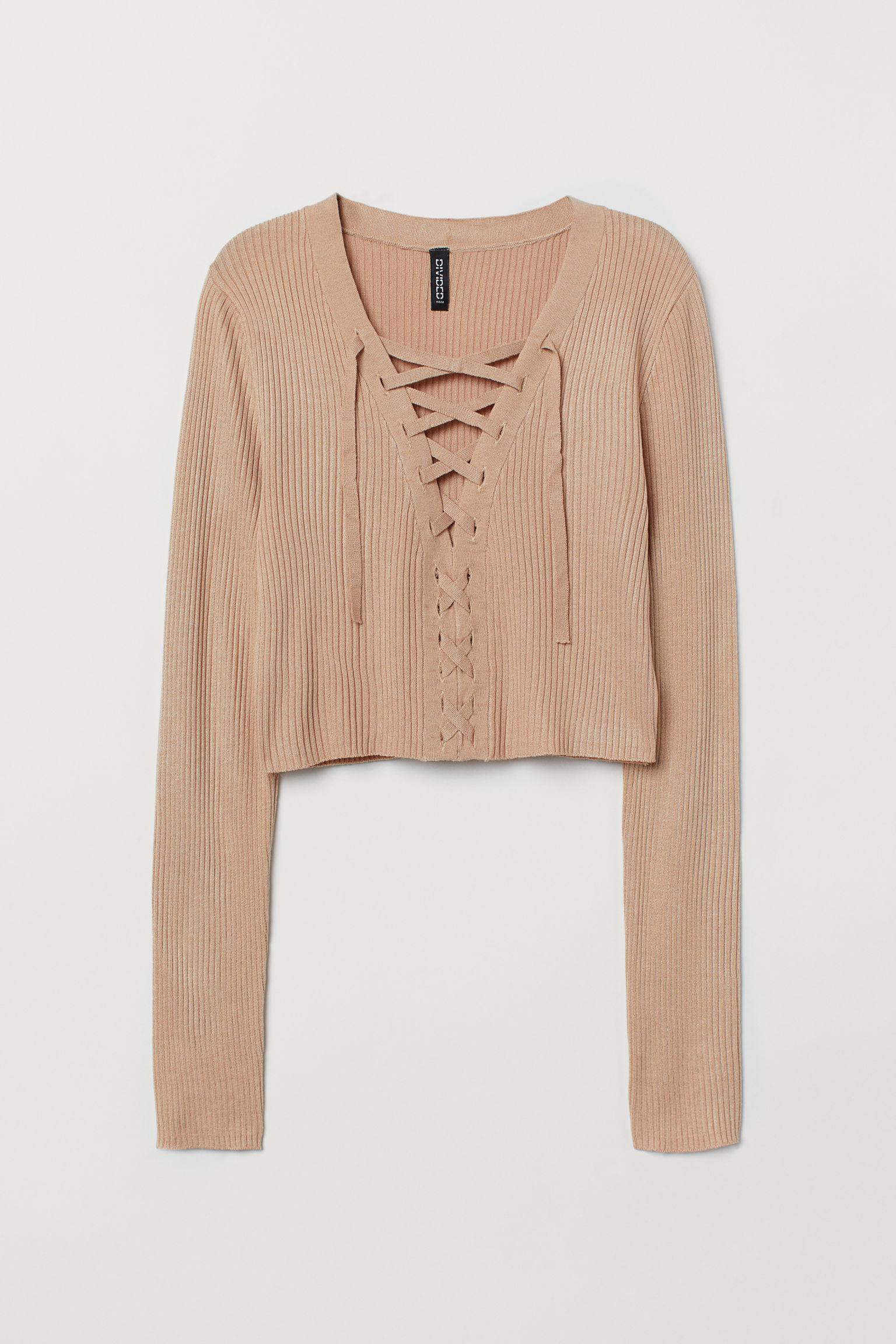 Top court en maille côtelée de viscose mélangée. Modèle à manches longues avec encolure en V et laçage devant. Coloris : neutre