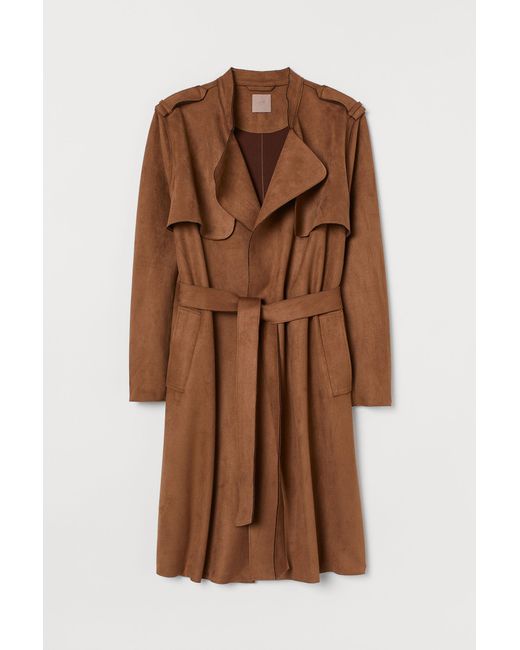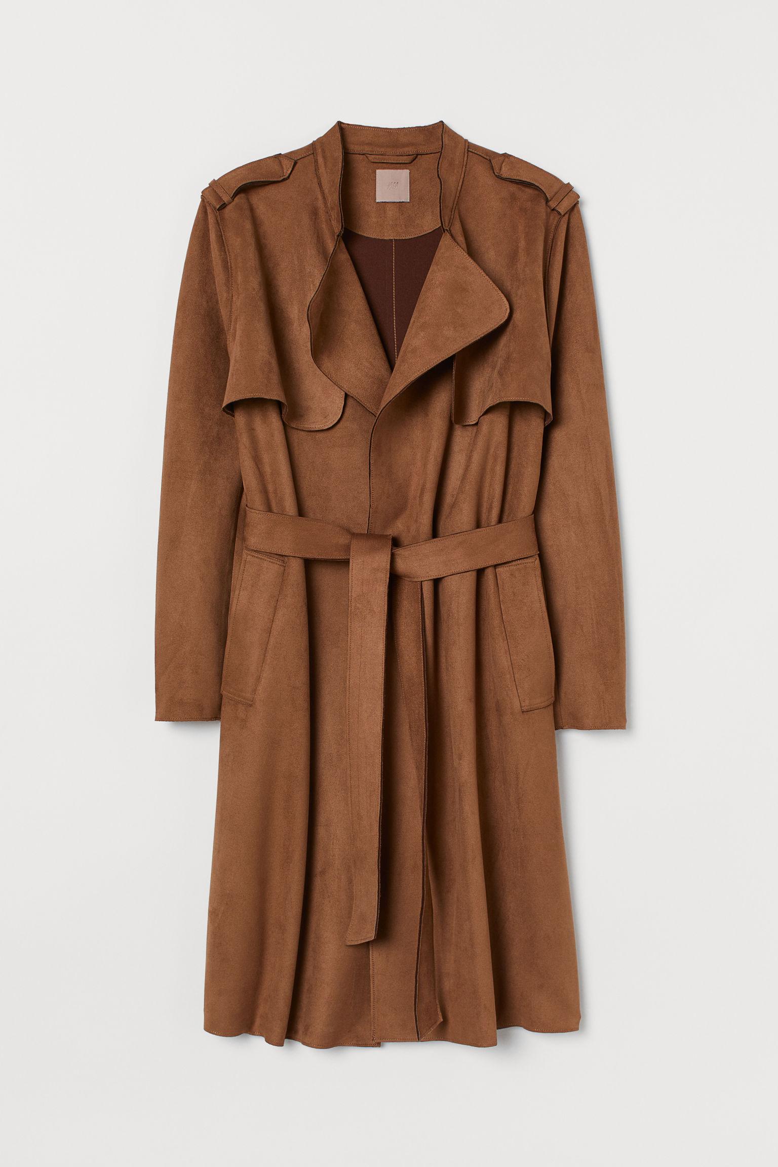 Trench-coat en suédine. Modèle avec épaulettes, petit col droit et revers drapés. Empiècement d'épaules flottant devant et dans le dos. Ceinture amovible à nouer à la taille et poches latérales. Non doublé. Coloris : neutre