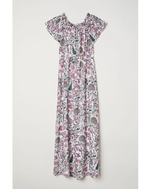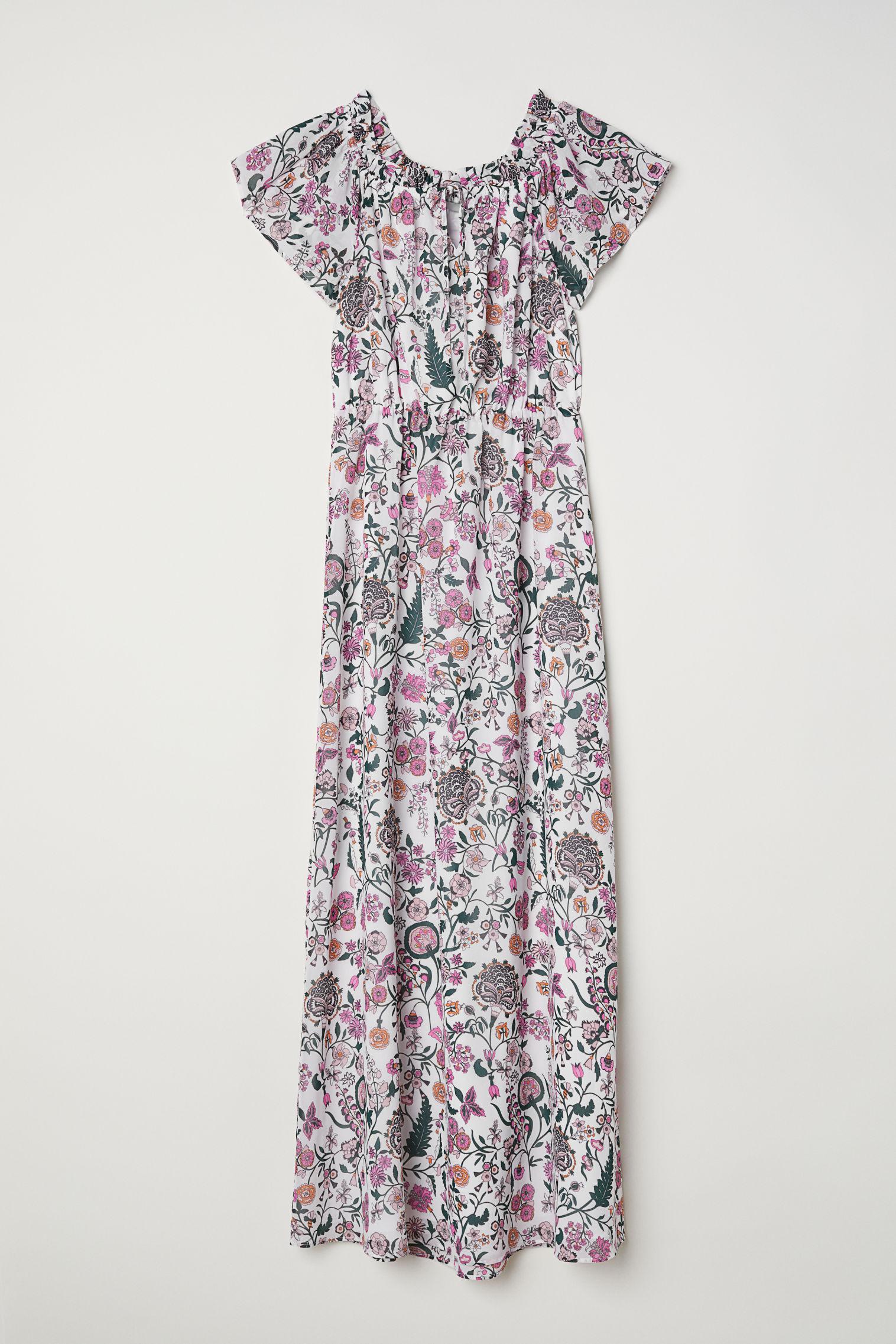Robe longue en tissu vaporeux. Modèle épaules nues avec élastique et bord volanté en haut. Ouverture surmontée de liens à nouer au niveau de l'encolure devant. Manches courtes. Découpe soulignée par mince élastique à la taille. Doublée. Coloris : blanc