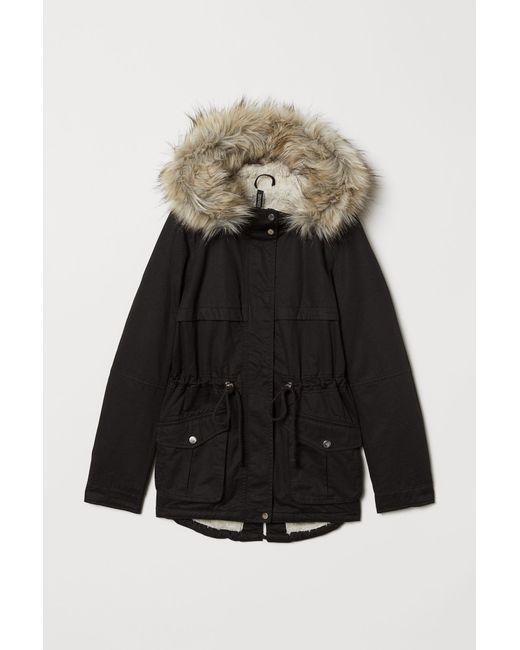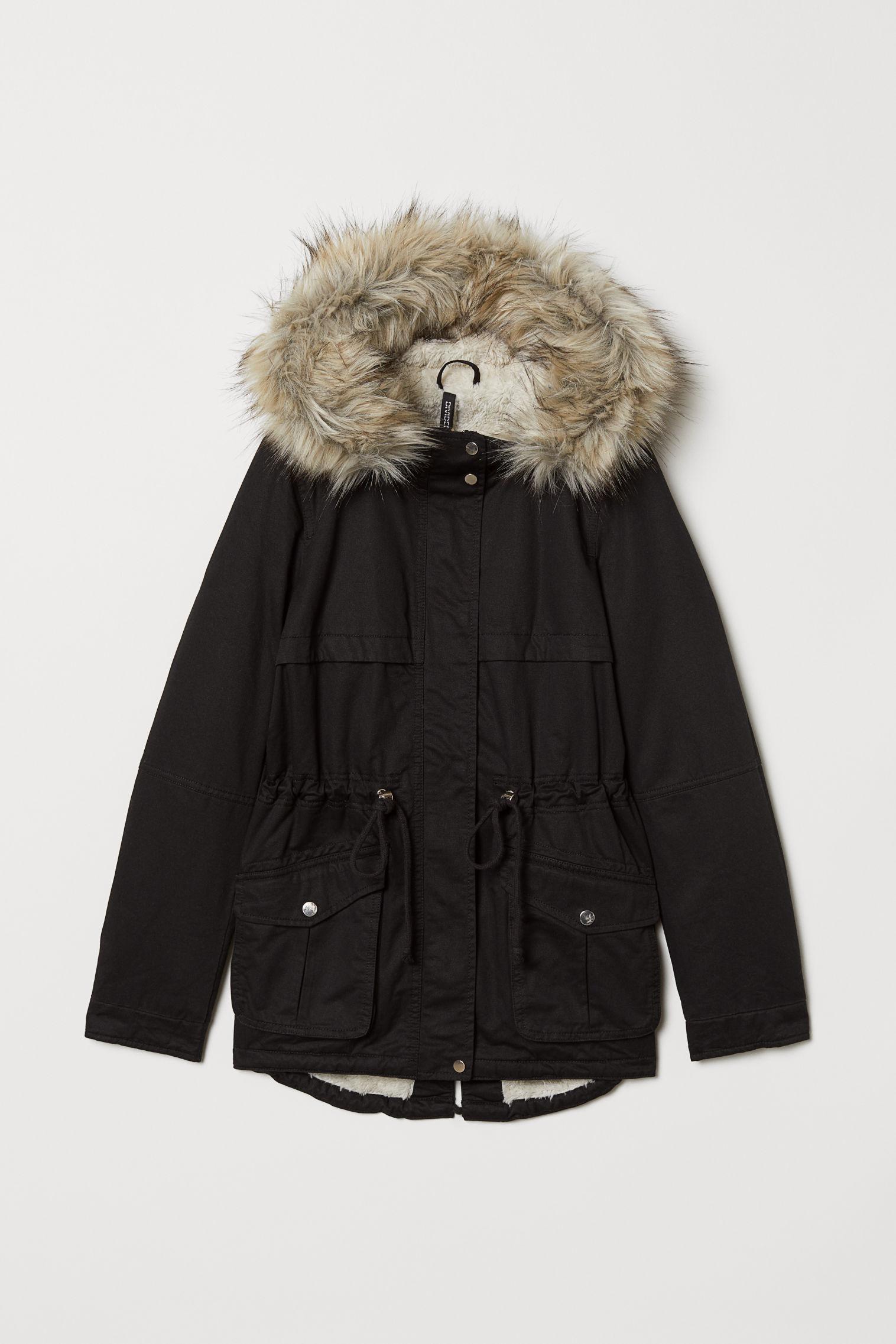 Parka courte en coton tissé. Modèle avec capuche doublée et agrémentée d'un bord amovible. Fermeture à glissière sous rabat coupe-vent muni de boutons-pression dissimulés devant. Poches avec pli creux et rabat pressionné devant. Lien de serrage à la taille et à la base. Patte pressionnée en bas de manche et fente dans le dos. Doublée peluche. Coloris : noir