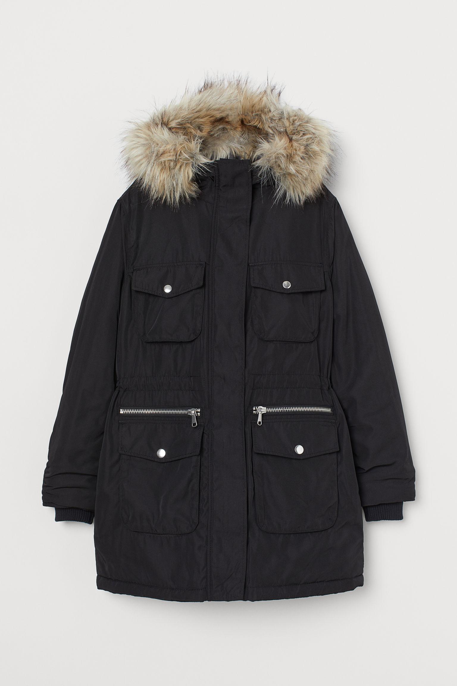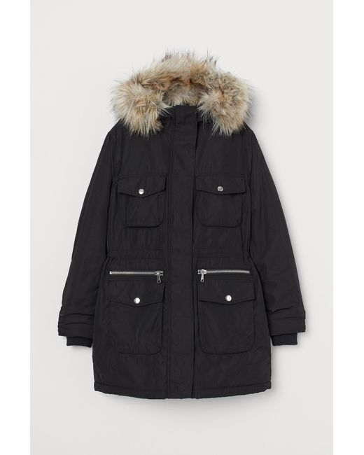 Parka matelassée et tissée. Modèle avec capuche doublée et munie d'un bord amovible. Fermeture à glissière munie d'un rabat coupe-vent auto-agrippant devant. Lien de serrage dissimulé à la taille, poches de poitrine et poches à rabat pressionné devant. Deux poches zippées supplémentaires devant. Bord-côte intérieur en bas de manche. Doublée. Coloris : noir