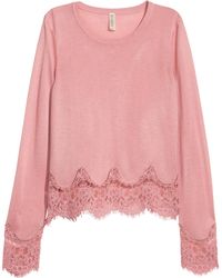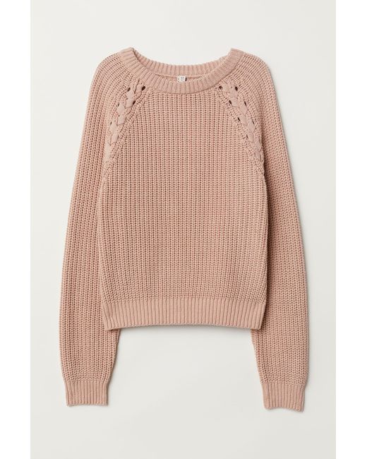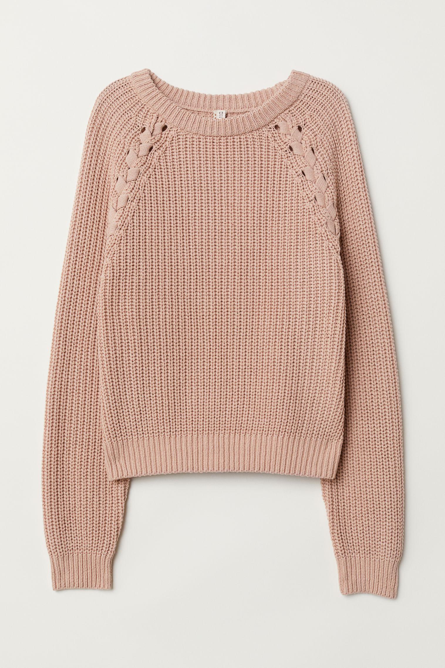 Pull court en maille épaisse de coton mélangé. Modèle avec détails tressés en haut et manches raglan. Coloris : rose