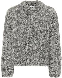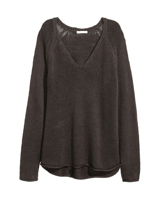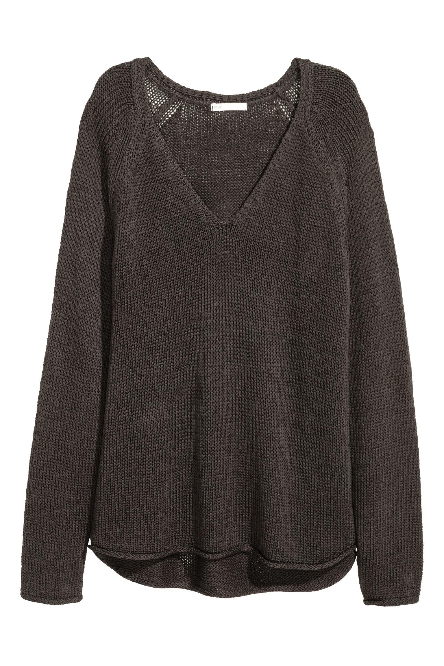 Pull en douce maille lâche. Modèle à encolure en V avec finition par bord roulé à la base et en bas des longues manches raglan. Plus de longueur dans le dos. Coloris : gris