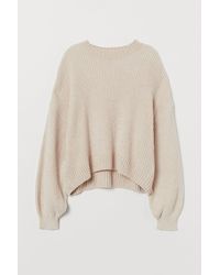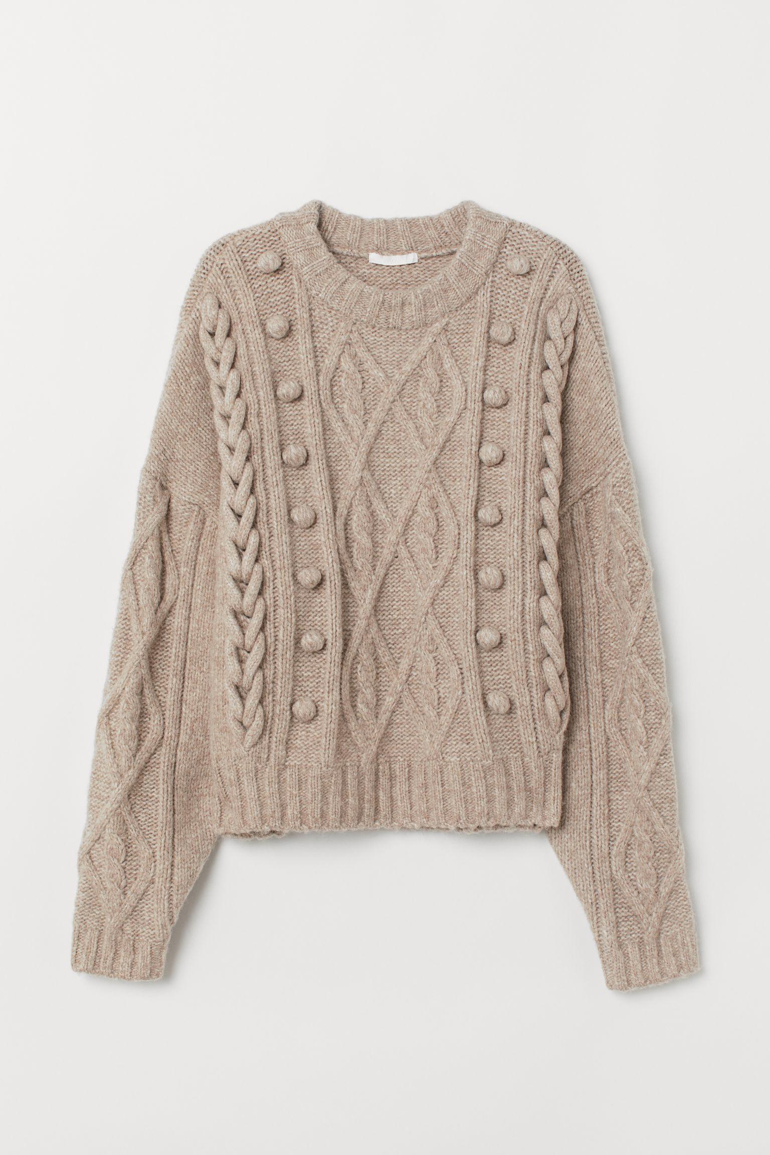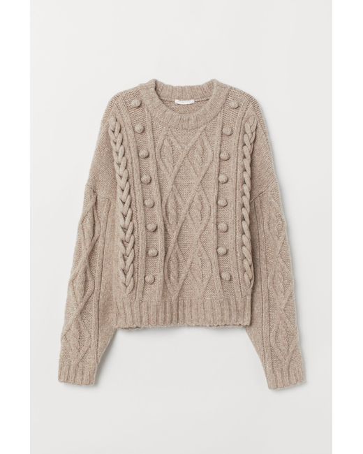 Pull en douce maille torsadée enrichie d'une touche de laine. Modèle avec parties tressées et pompons devant. Emmanchure descendue. Finition en maille côtelée à l'encolure, à la base et en bas de manche. Coloris : neutre