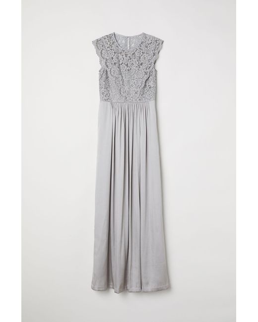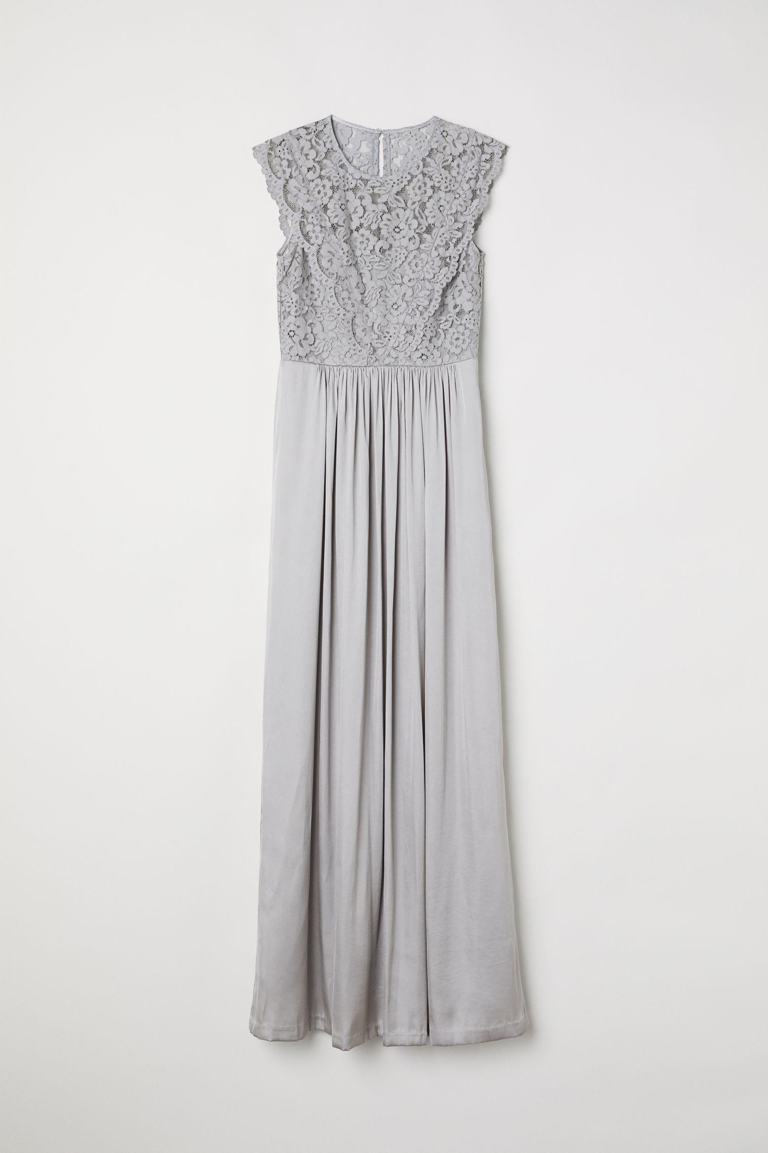Robe longue avec corsage en dentelle et jupe en satin. Modèle à petits mancherons avec ouverture dans le dos surmontée d'un bouton sur la nuque. Fermeture à glissière dissimulée d'un côté. Découpe à la taille. Doublée. Coloris : gris