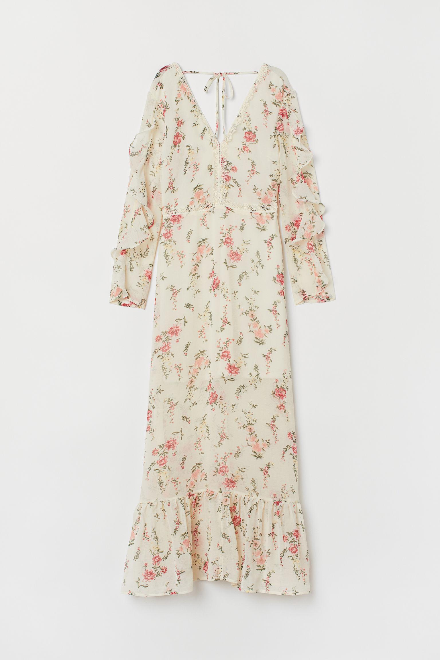 Robe longue en tissu froissé et vaporeux à motif imprimé. Modèle avec encolure en V devant et dans le dos. Liens transversaux à nouer sur la nuque. Ruban de dentelle à l'encolure et à la taille. Manches longues avec volants. Découpe à la base avec large bord volanté. Partiellement doublée. Coloris : blanc