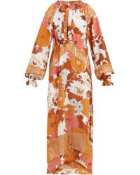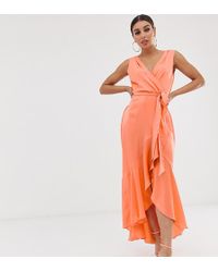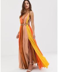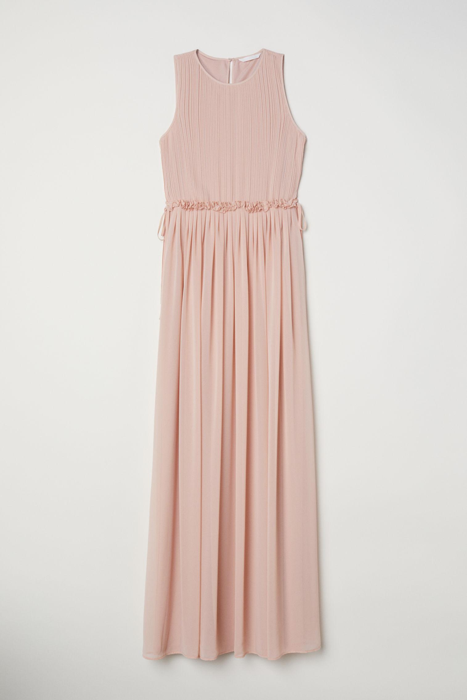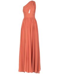 Robe longue en mousseline vaporeuse avec corsage plissé. Modèle sans manches avec découpe à la taille soulignée par petit volant froncé et fines lanières latérales. Ouverture dans le dos surmontée d'un bouton sur la nuque. Jupe froncée au joli tombé. Doublée. Coloris : orange