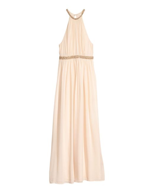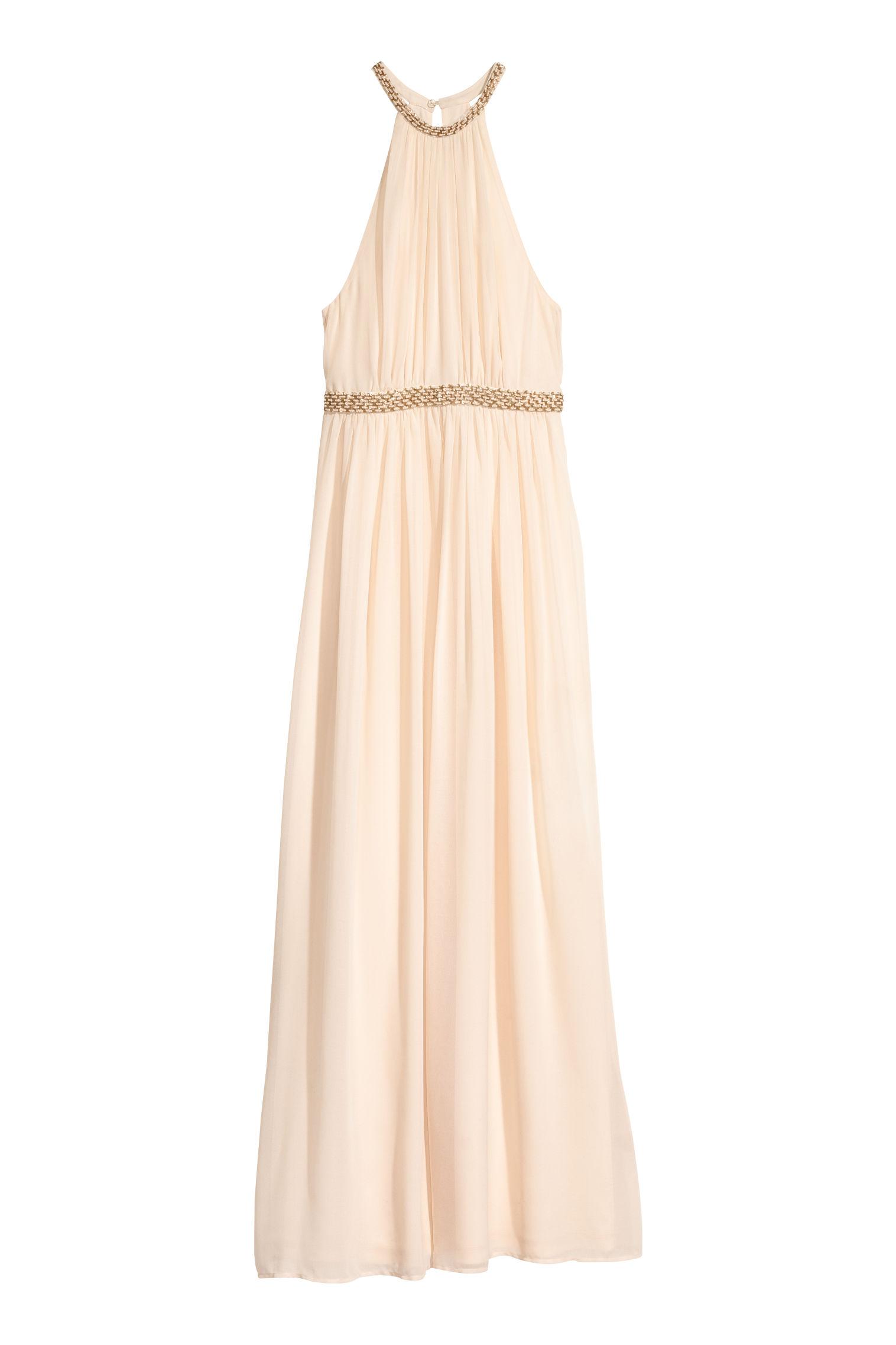 Robe longue en mousseline aérienne avec détails de perles fantaisie. Modèle avec découpe à la taille agrémentée d'un ruban orné de perles fantaisie et de paillettes devant. Dos nu avec bouton dissimulé sur la nuque et élastique à la taille. Doublée. Coloris : blanc