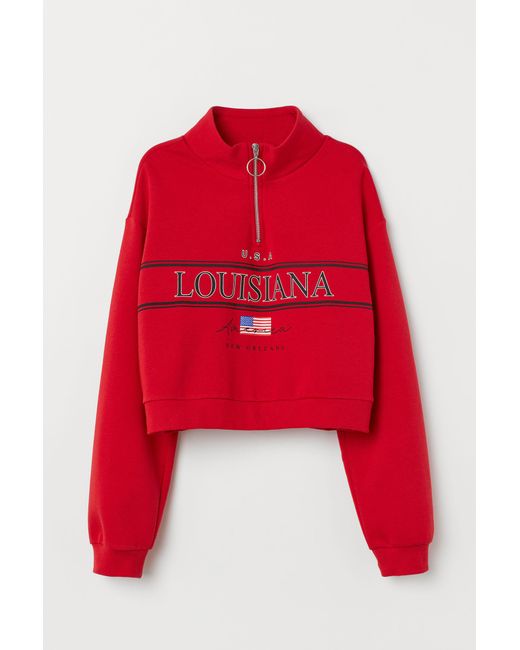 Sweat plutôt court en molleton. Modèle à col droit avec fermeture à glissière en haut. Finition bord-côte à la base et en bas des manches longues. Intérieur doux et brossé. Coloris : rouge