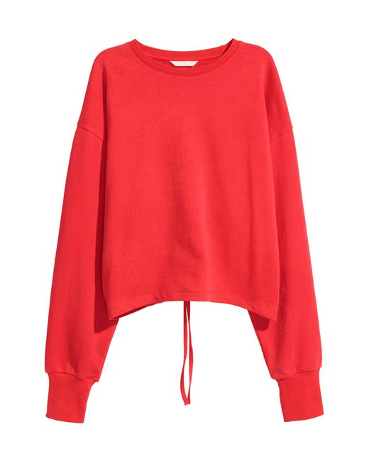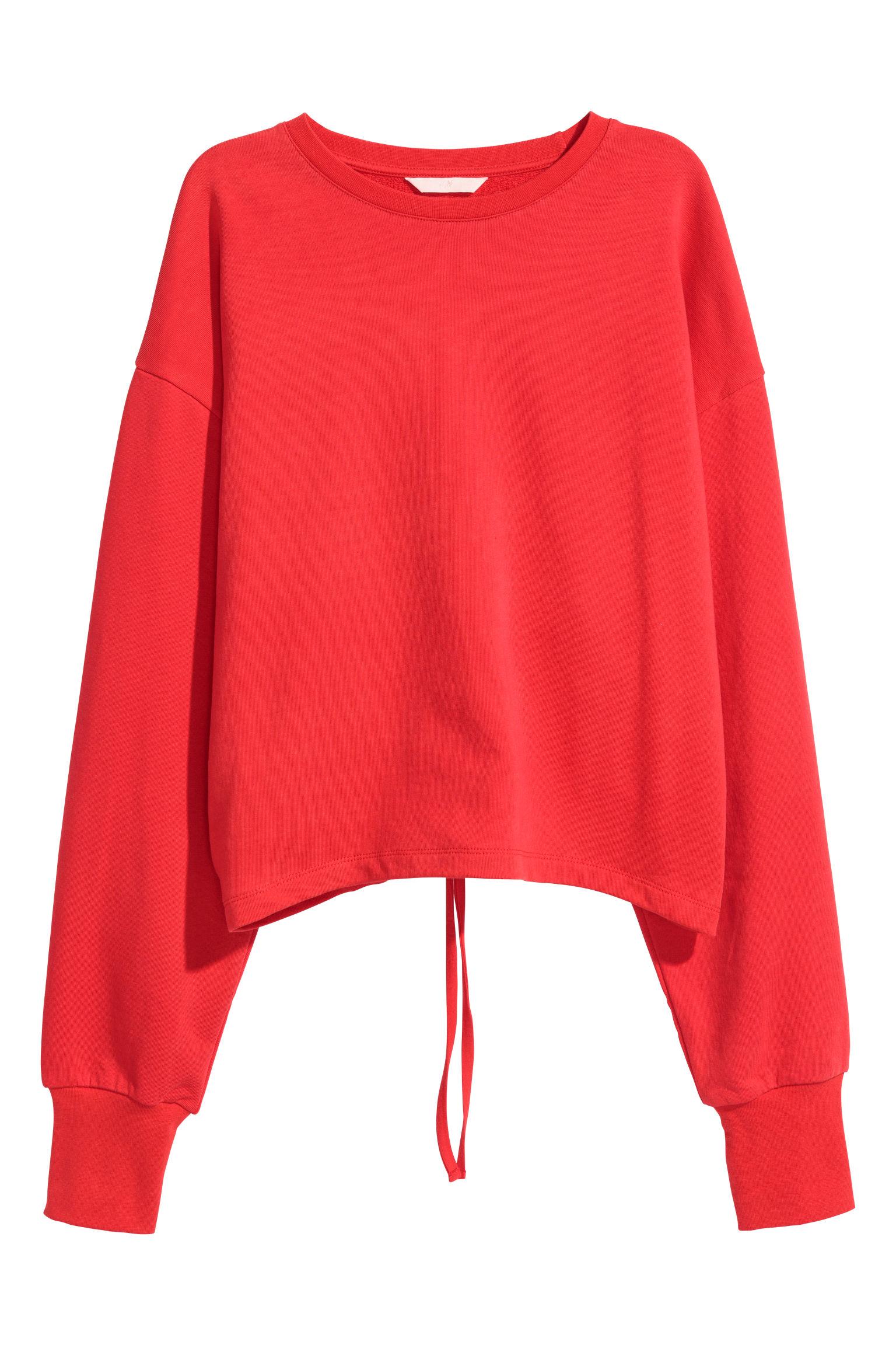Sweat en molleton léger. Modèle avec emmanchure fortement descendue et manches larges, terminées par petit bord-côte. Ouverture ronde avec lien de serrage décoratif dans le dos créant une base asymétrique. Coloris : rouge