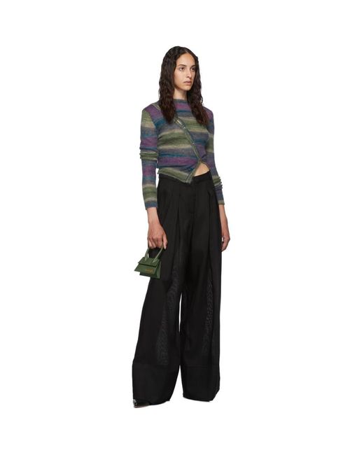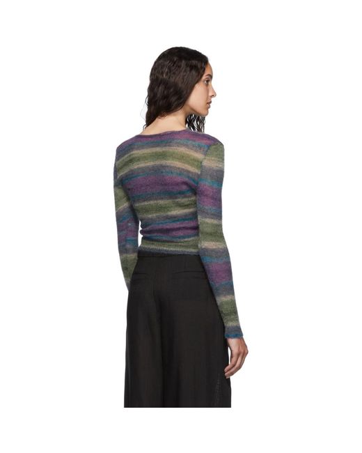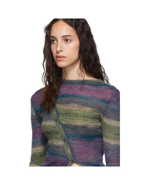 Pull a manches longues en maille de mohair et dalpaga raye mauve, vert et bleu. Col ras du cou. Patte de boutonnage asymetrique a lavant. Couleur du fournisseur: Stripe purple. Coloris : multicolore