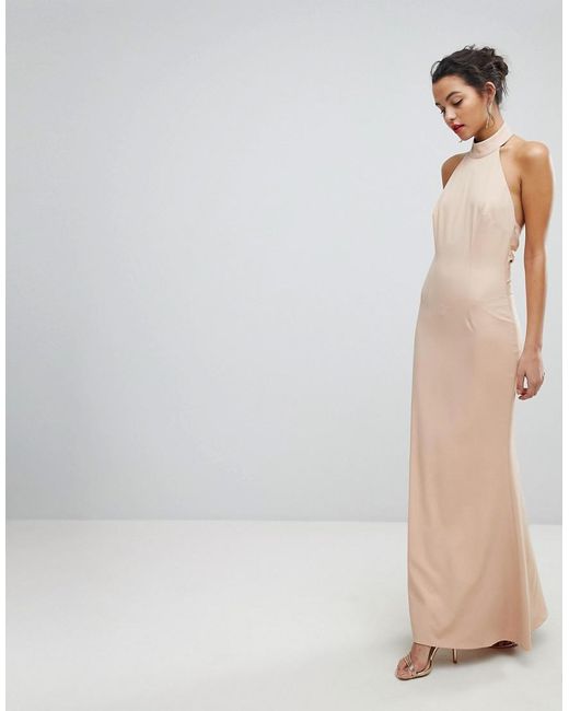 Robe longue froncée à dos ouvert et encolure haute femme de coloris rose