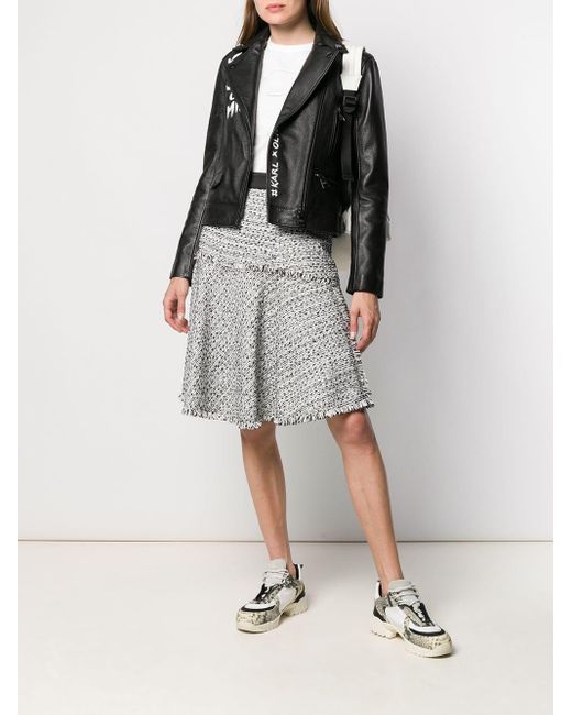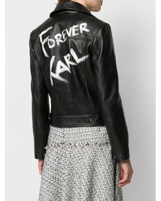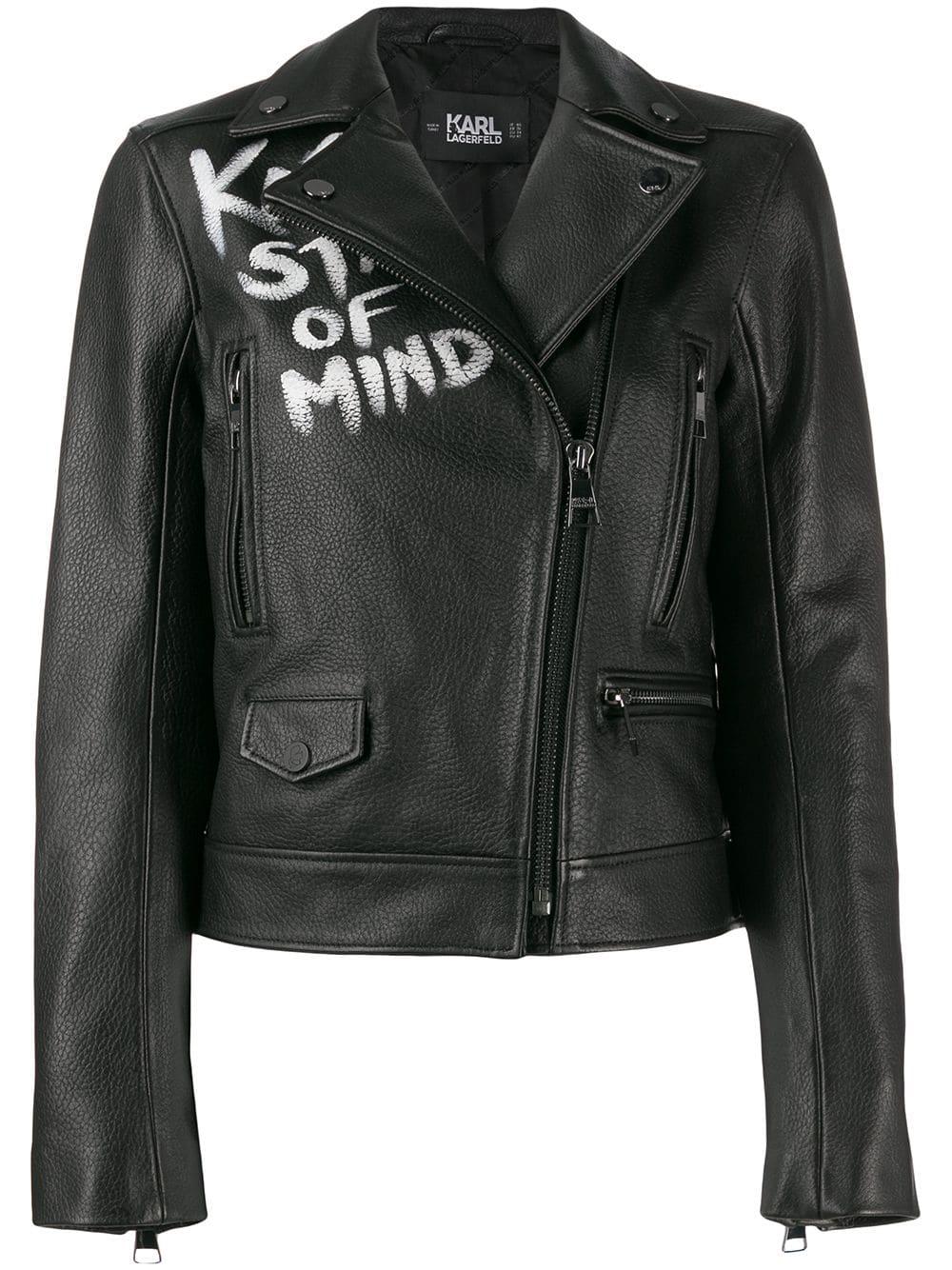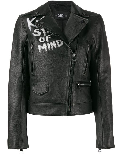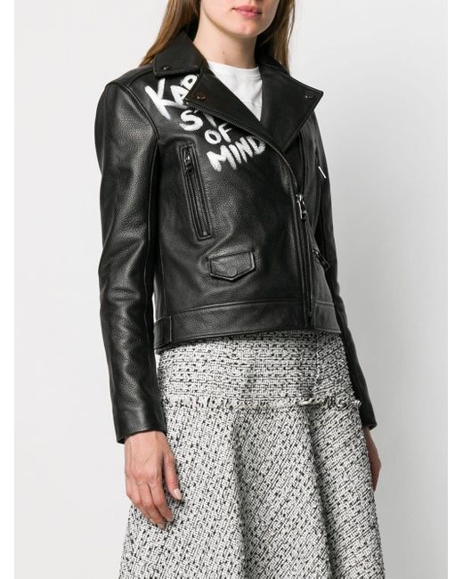 Veste de moto Karl X Olivia en cuir d'agneau Karl Lagerfeld avec col pointu, fermeture zippée en biais, imprimé devant, poches devant zippées, manches longues, poignets zippés, logo imprimé à l'arrière, side waist tabs et doublure monogrammée. Couleur : noir. Coloris : noir