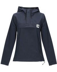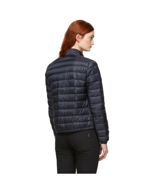 Blouson a manches longues matelasse en duvet et nylon bleu marine. Patte a boutons-pression au col droit. Fermeture a glissiere bidirectionnelle a lavant. Poches plaquees a la taille. Revers et ourlet elastiques. Applique a logo tricolore au haut de la manche. Ferrures ton sur ton et argentees a gravure du logo. Coutures ton sur ton. Rembourrage: 90% duvet, 10% plumes. Coloris : bleu