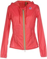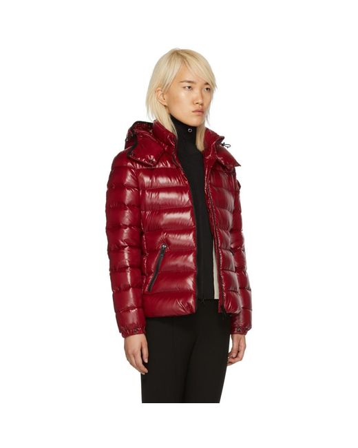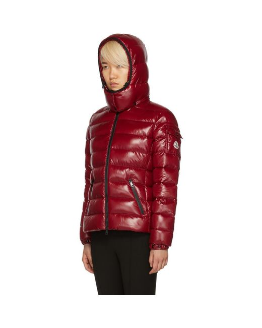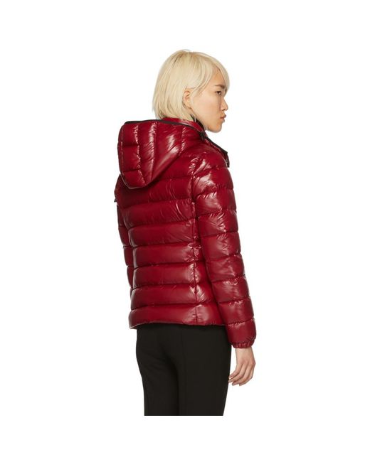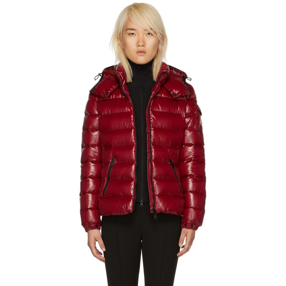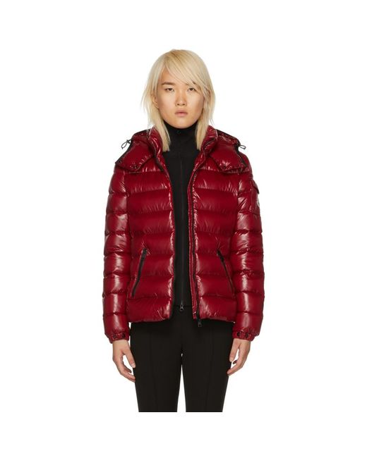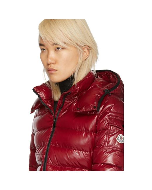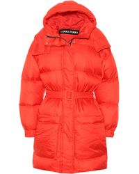 Blouson a manches longues matelasse en duvet et satin de nylon rouge. Capuche a boutons-pression, cordon coulissant elastique et garniture en gros-grain noire amovible au col droit. Fermeture a glissiere bidirectionnelle a lavant. Poches a glissiere a la taille. Poche utilitaire a ecusson a logo feutre au haut de la manche. Patte reglable a boutons-pression aux poignets elastiques. Entierement double. Ferrures noires. Coutures ton sur ton. Rembourrage: 90% duvet doie, 10% plumes. Coloris : rouge