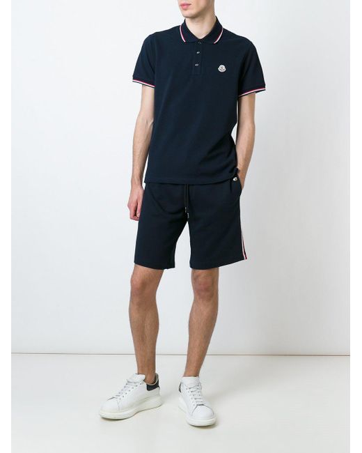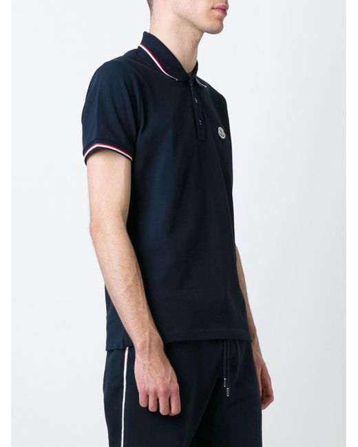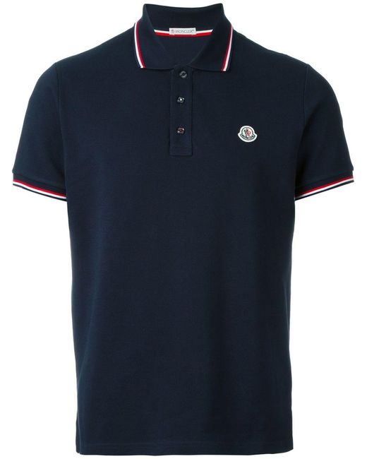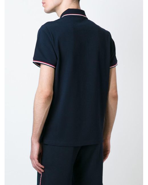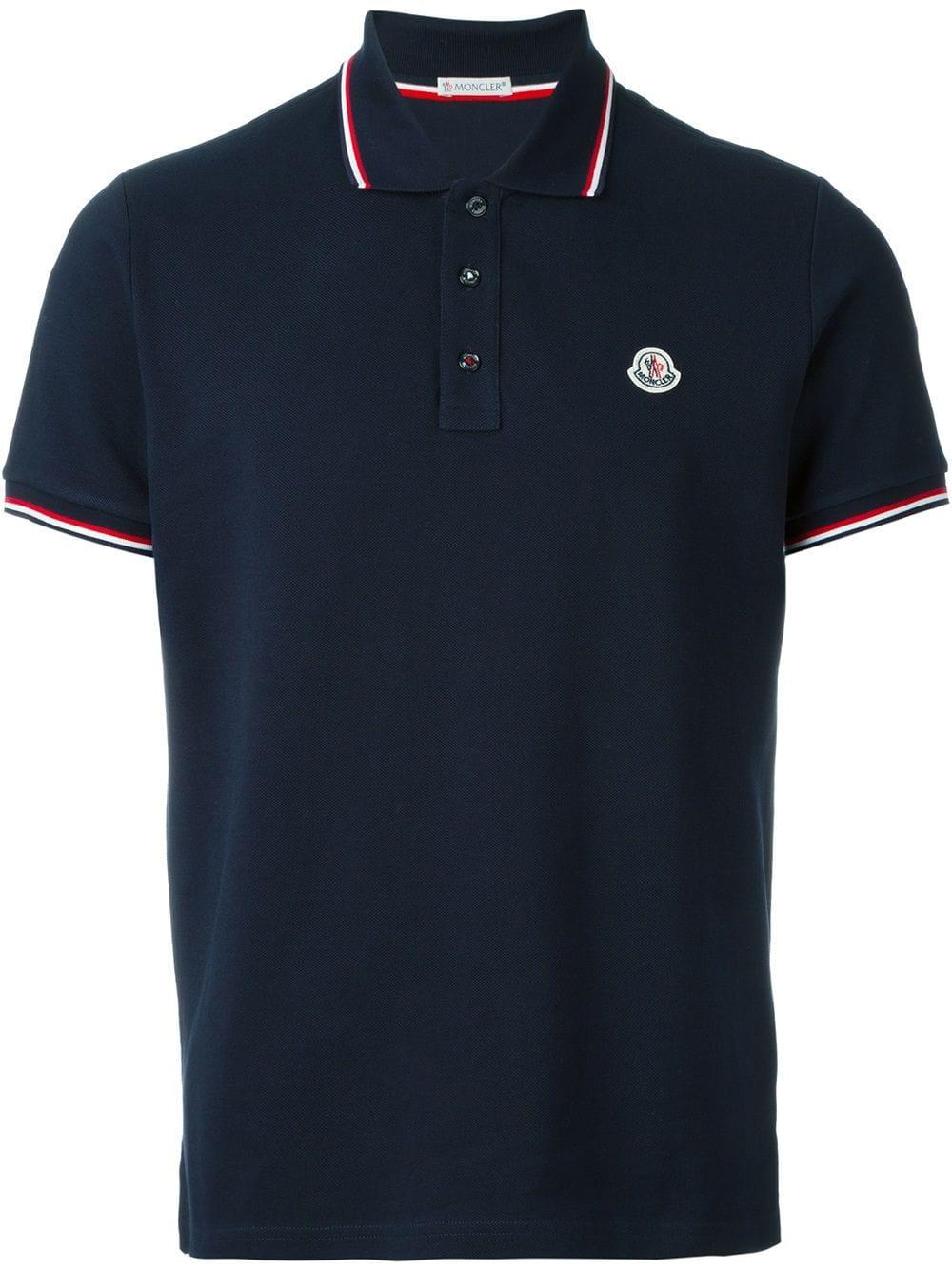 Polo en coton bleu nuit à détails contrastants Moncler avec col polo classique, patte de boutonnage sur le devant, patch logo brodé sur la poitrine, manches courtes, fentes latérales et ourlet droit. Coloris : bleu