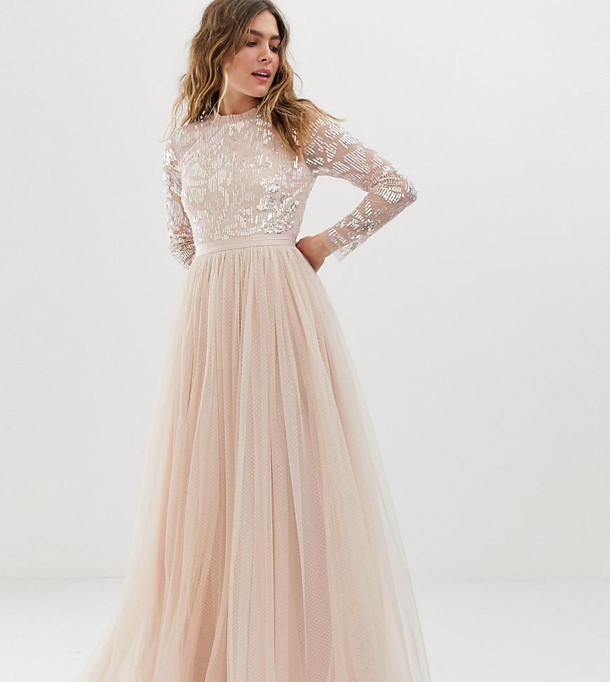 Robe longue manches longues ornementée avec jupe en tulle - Rose quartz femme