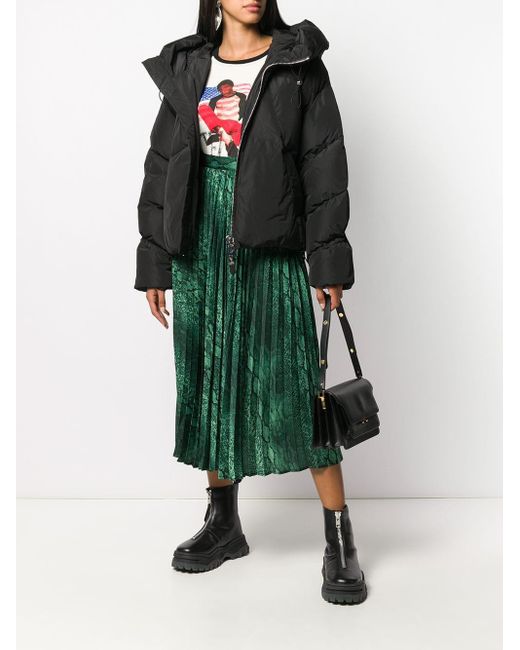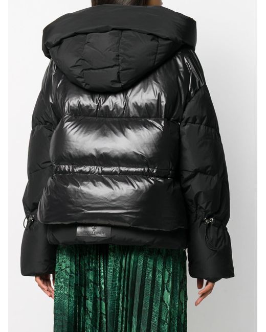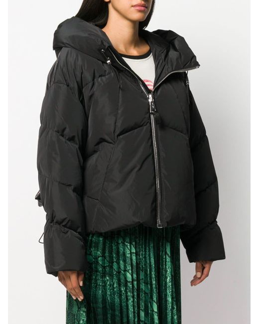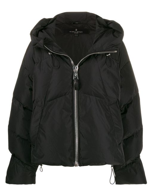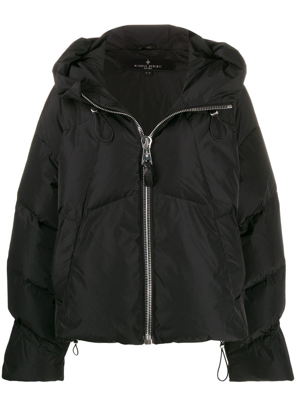 Doudoune Matignon Nicole Benisti avec capuche à lien de resserrage, col officier, fermeture zippée devant, manches longues, poches latérales fendues, ourlet à lien de resserrage et coupe oversize. Couleur : noir. Coloris : noir