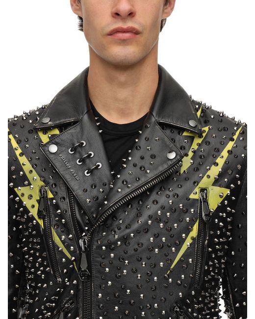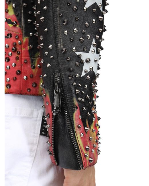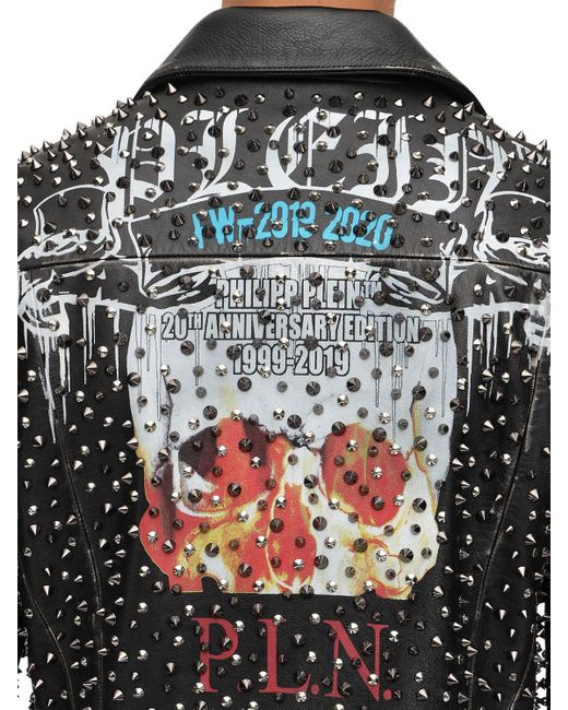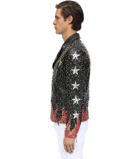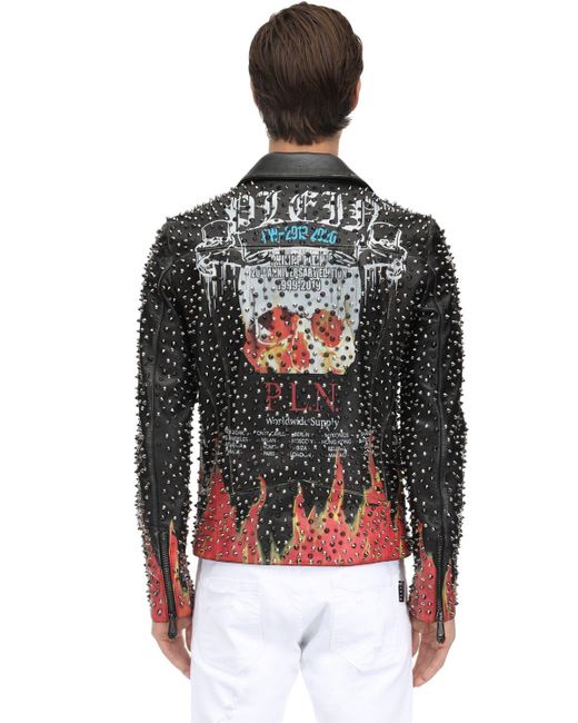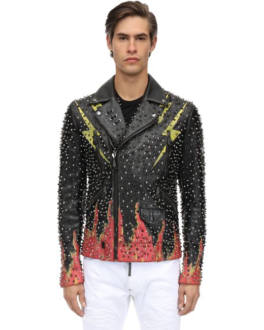 Revers crantés avec boutons-pression. Fermeture éclair frontale excentrée. Fermeture éclair aux poignets. Partie basse avec boutons-pression. Imprimé sur le devant, arrière et manches. Emplacement des décorations pouvant subir de légères variations. Clous décoratifs. Deux poches zippées sur la poitrine. Deux poches latérales zippées. 100%cow. Coloris : noir