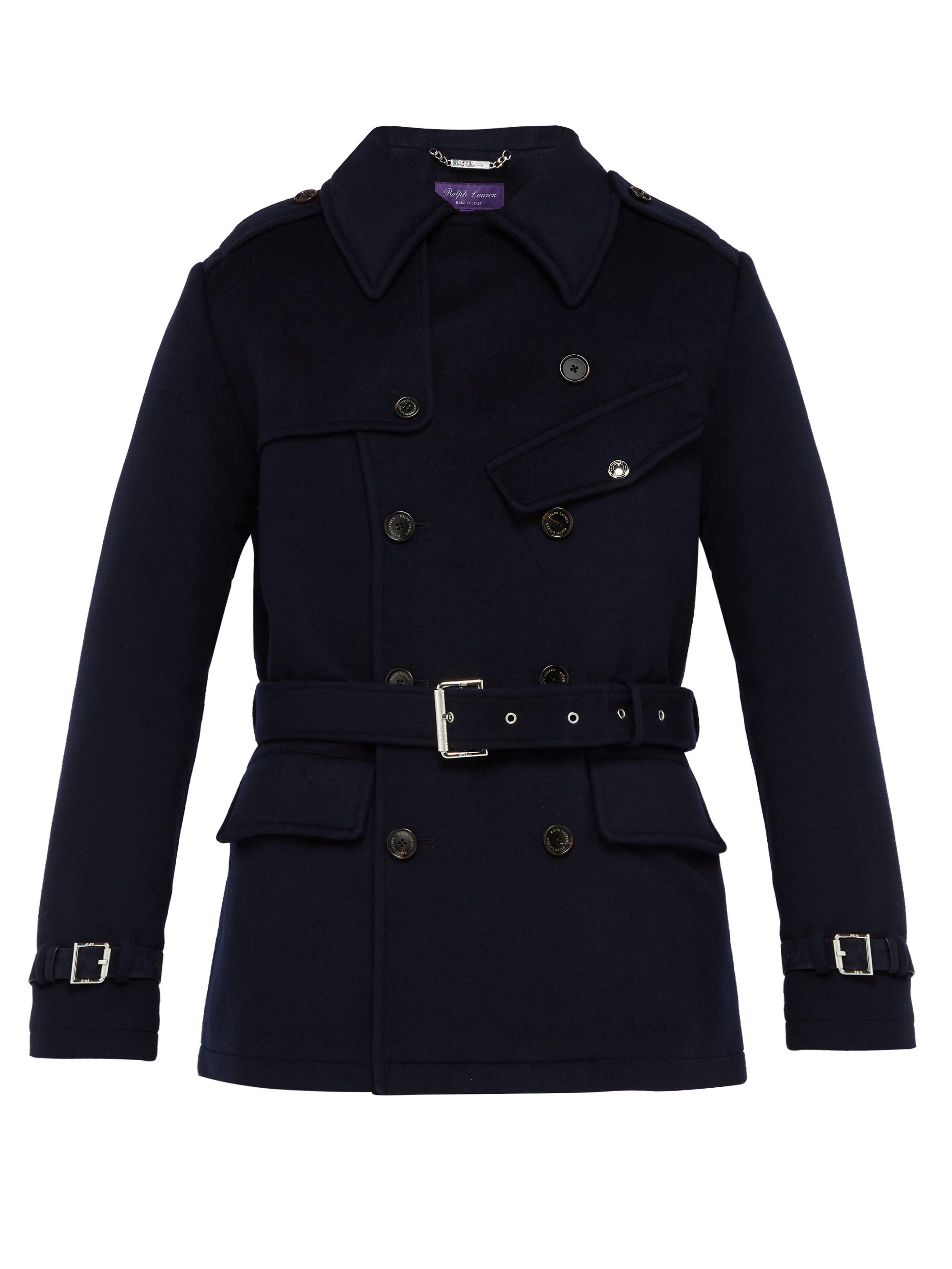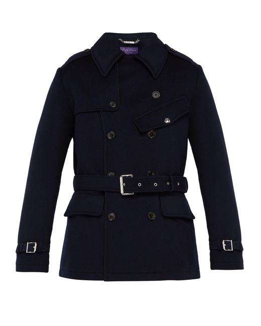 Pour la saison printemps-été 2019, Ralph Lauren Purple Label offre une version raccourcie pleine de modernité du trench-coat classique. Confectionné en laine melton double-face provenant d'une fabrique italienne, il présente des éléments distinctifs tels que des pattes d'épaule, un bavolet tempête arrière et des brides à boucle bordées de cuir. Une poche poitrine à rabat lui confère un style motard. Sa coupe est conforme à la taille indiquée. Coloris : bleu