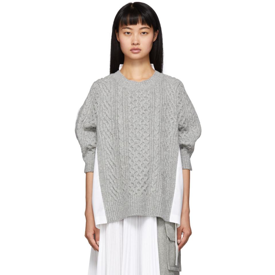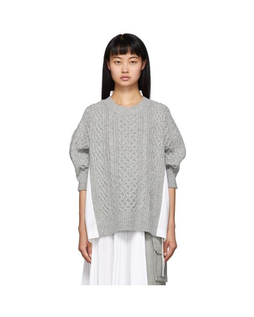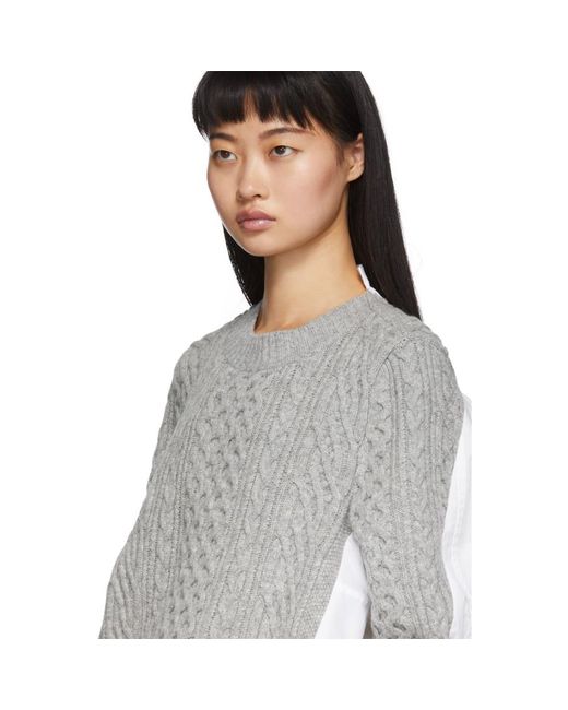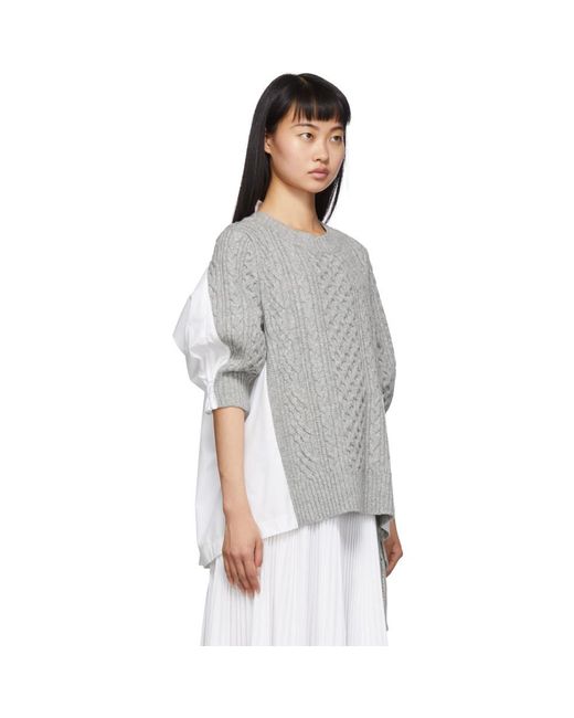 Pull a manches mi-longues en maille torsadee de laine grise et popeline de coton melange blanche. Col ras du cou en maille cotelee. Poignets elastiques. Patte de boutonnage a larriere du col. Plis et patte de boutonnage dissimulee au dos. Ourlet allonge au dos. Couleur du fournisseur: Light grey. Coloris : gris