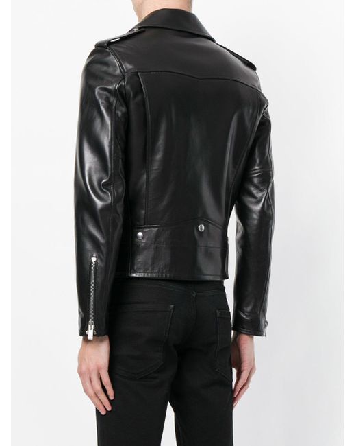 Veste de moto en peau d'agneau noire à poches zippées Saint Laurent avec revers classiques, fermeture zippée en biais, manches longues, poignets zippés, épaulettes, poches devant zippées, poche devant à rabat, passants de ceinture et épaulettes.