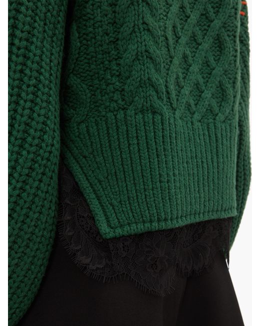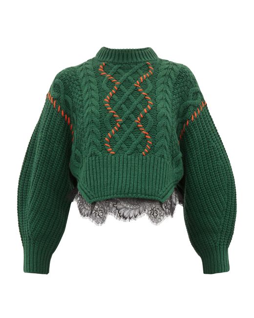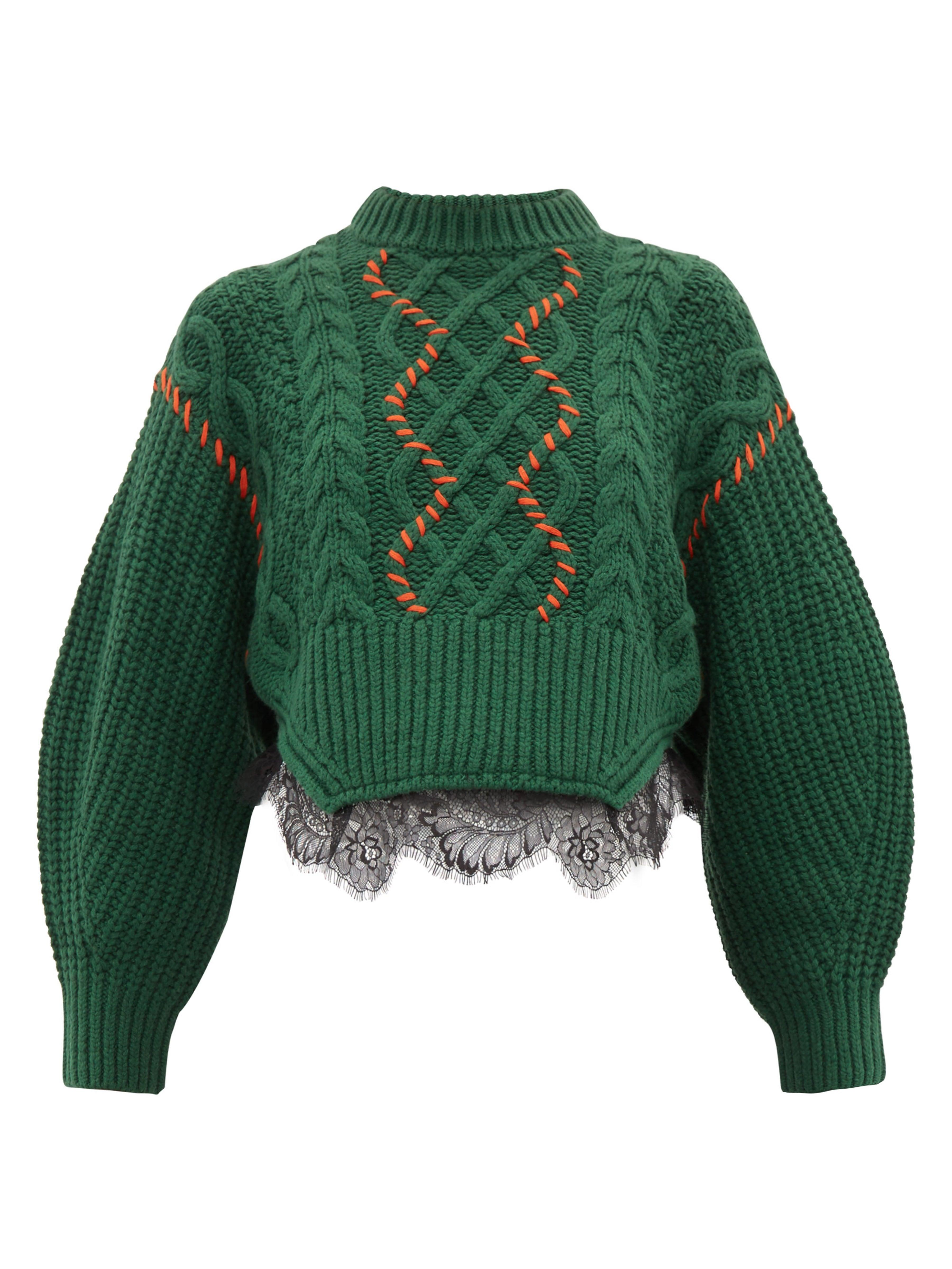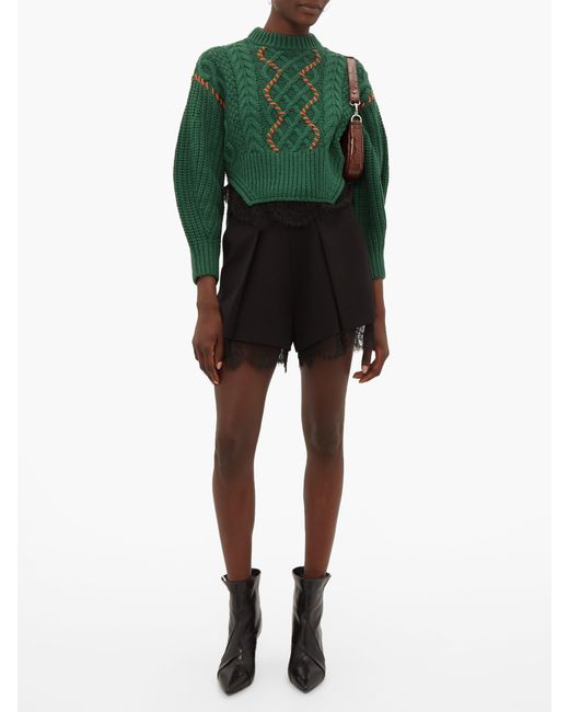 Self-Portrait adopte une palette automnale pour révéler ce pull vert forêt issu de sa collection automne-hiver 2019. Confectionné en maille épaisse de coton mélangé à une touche de laine, il est doté d'un col roulé côtelé. Ses finitions en point de surjet rouge coquelicot et ses détails en dentelle noire lui confèrent une allure féminine saisissante. Portez-le avec un short habillé et des bottes en cuir pour une tenue de jour décontractée. Coloris : vert