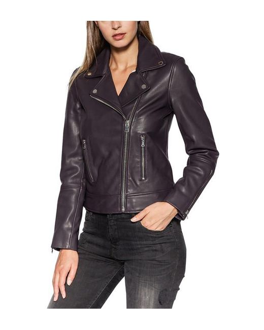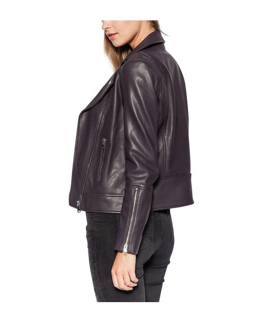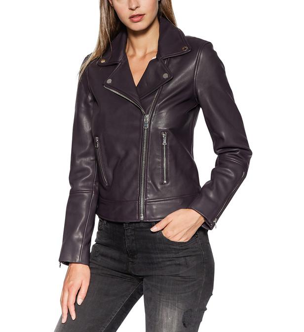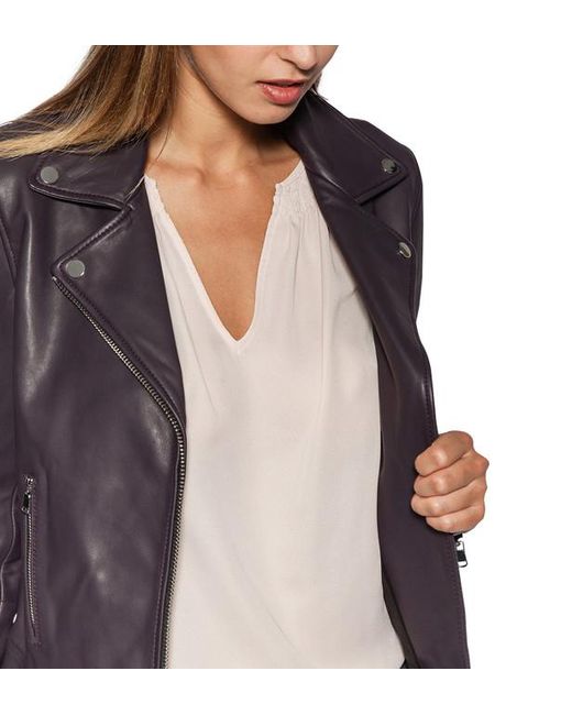 Blouson biker court, en cuir d'agneau, doté d'un col cranté à revers pressionnés, de manches longues zippées, d'une fermeture à glissière asymétrique et de 2 poches à zip sur le devant. Coloris : multicolore